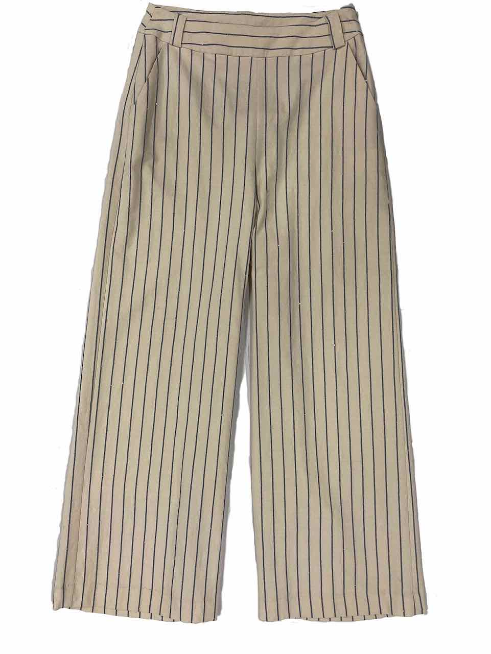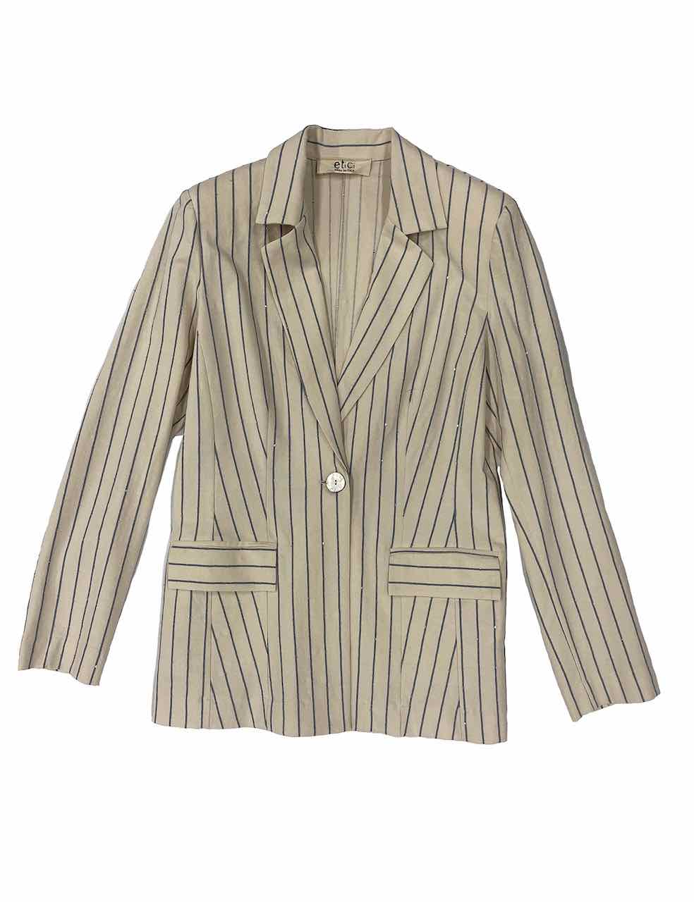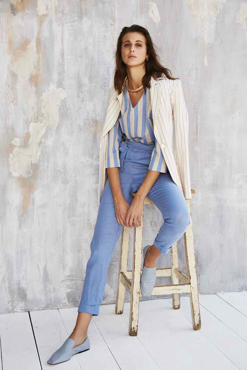 Non ci si stanca mai di indossare il tailleur gessato di Etici, nato per illuminare ogni giornata. Con righe blu notte su fondo avorio, è composto da giacca sfoderata monopetto chiusa da un bottone e dotata di revers discreti e da pantaloni ampi, allacciati sul fianco, con comode tasche.