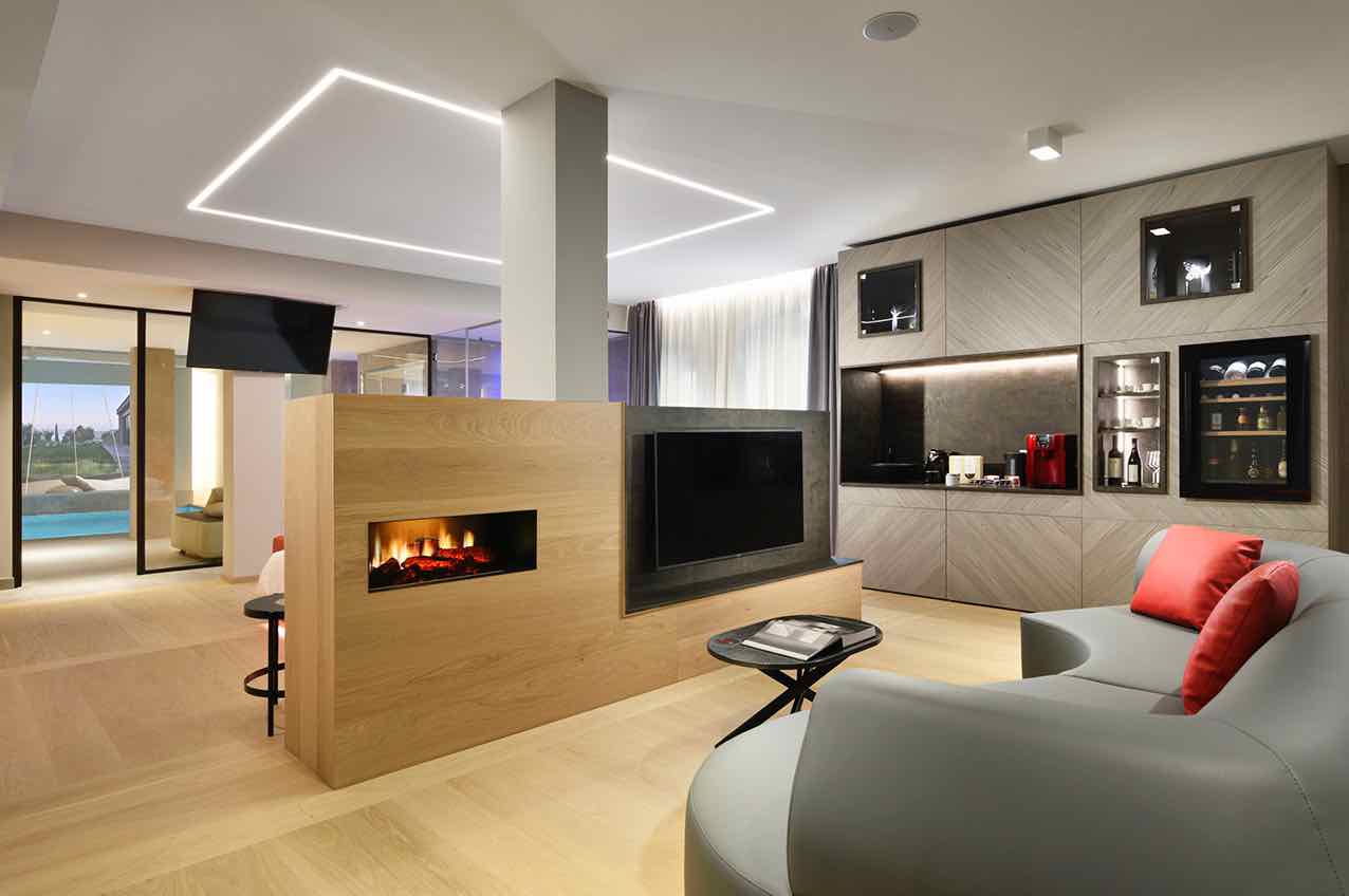 Unica nel design, questa suite da sogno permette di staccare dal lavoro con una SPA privata ad uso esclusivo, grazie alla sauna finlandese e alla piscina interna privata a 34° con panche idromassaggio sommerse. La suite si compone di camera con letto matrimoniale con reti motorizzate anatomiche basculanti personalizzabili e zona bagno, zona giorno con romantico camino elettrico, grande divano, letto relax di coppia, Smart hospitality TV. E poi ancora ampia vetrata con vista, patio sul giardino e lettini solarium.