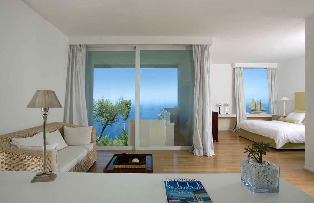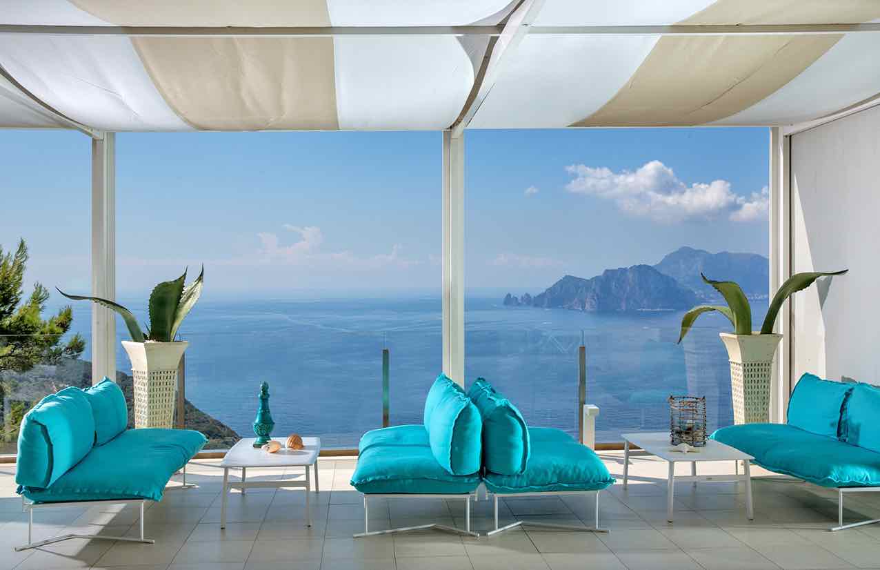 Le camere si differenziano le une dalle altre per spazi, arredi e dettagli, alcune con giardino, altre con balcone privato, tutte diverse e con vista mare. Le più esclusive sono le Special Sea view, con idromassaggio vista Capri, balcone privato, vetrata ad angolo e letto king size posizionato di fronte alla scenografica finestra.