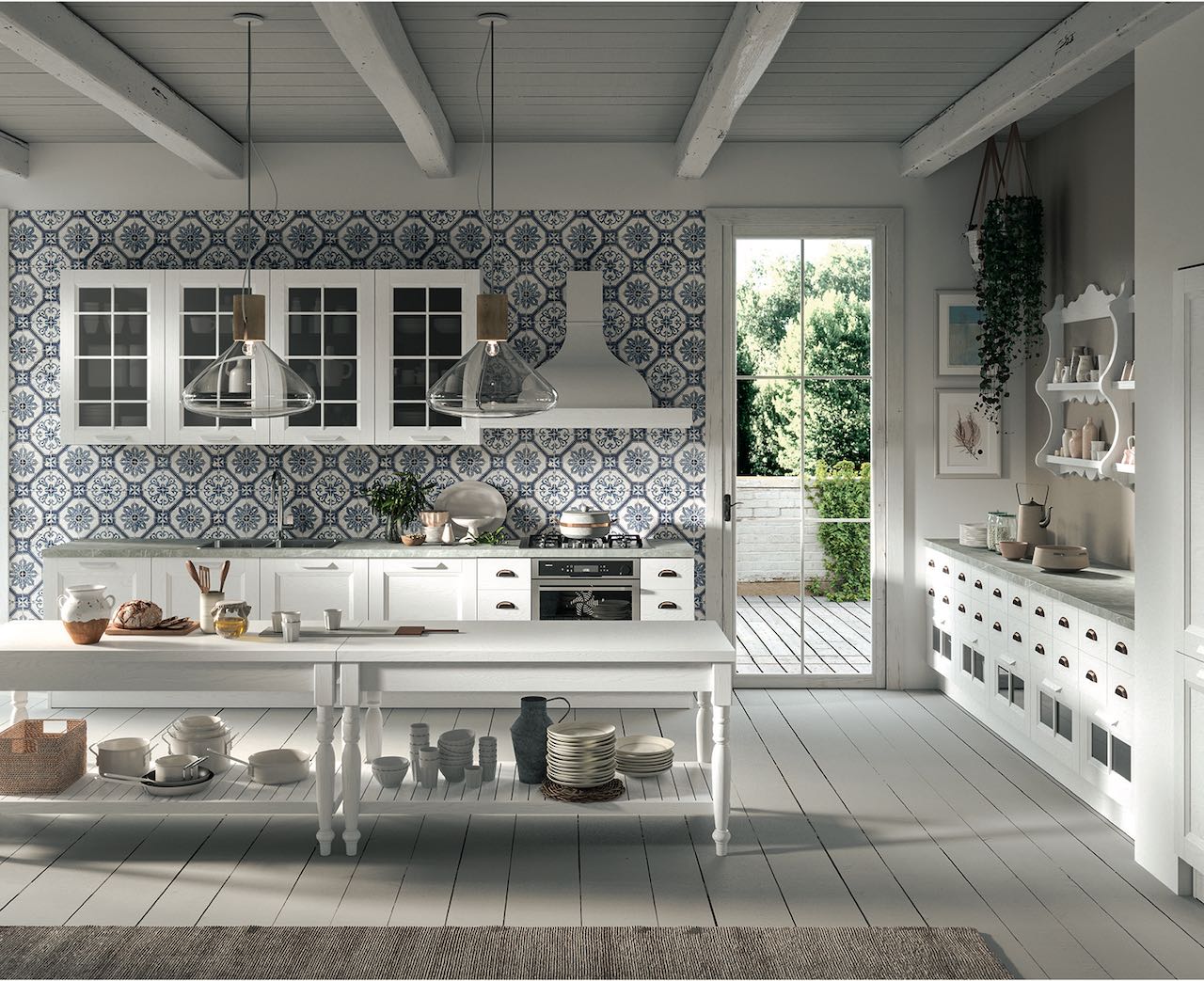 ARAN Cucine, capace di offrire soluzioni sempre versatili, propone una composizione di Ylenia perfetta sia nelle case al mare sia in quelle di campagna, accogliente e calorosa come lo sono gli spazi dedicati alla convivialità. Lo stile è un mix tra il rustico e lo shabby chic, con echi del passato ed elementi tradizionali. Il frassino laccato bianco illumina l’ambiente, trasmette serenità, e valorizza i moduli più ‘vintage’. Tra questi spiccano il bancone multifunzione stand alone, con le gambe tornite come nei tavoli di una volta, le piattaie da utilizzare come moduli a giorno, e infine l’ampia credenza progettata con una serie di cassetti in stile vecchia farmacia. L’unità operativa della cucina, con zona cottura e lavaggio, prevede ante con telaio per le basi; qui le maniglie in legno laccato a poro aperto creano un elegante contrasto con quelle tondeggianti e in ottone dei cassetti. I pensili, come ‘vetrine all’inglese’, hanno l’anta in vetro con griglia in legno, e l’elemento cappa, realizzato da ARAN Cucine, è un ulteriore dettaglio capace di creare armonia e coerenza stilistica. A completare la composizione, un’armadiatura incassabile a muro in cui alloggiare elettrodomestici e vani dispensa.