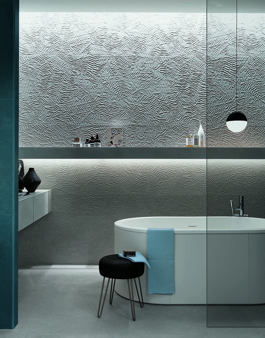 Bloom Star è la più grande piastrella da rivestimento in pasta bianca con struttura tridimensionale firmata FAP ceramiche. L’inedito formato 80×160 cm conferisce continuità visiva allo spazio e disegna pareti con grafiche sorprendenti e soprattutto il minor numero di fughe possibili. Proprio perché ricavata in pasta bianca, la lastra Bloom Star 80×160 cm è leggera, facile da tagliare e forare e, non meno importante, di facile movimentazione. Ispirata a lavorazioni artigianali, Bloom Star rivela pareti preziose e allo stesso tempo intime, all’insegna del contrasto luce-ombra, in cui il grande formato ne accentua la piacevole illusione, i chiaroscuri e la rifrazione della luce.