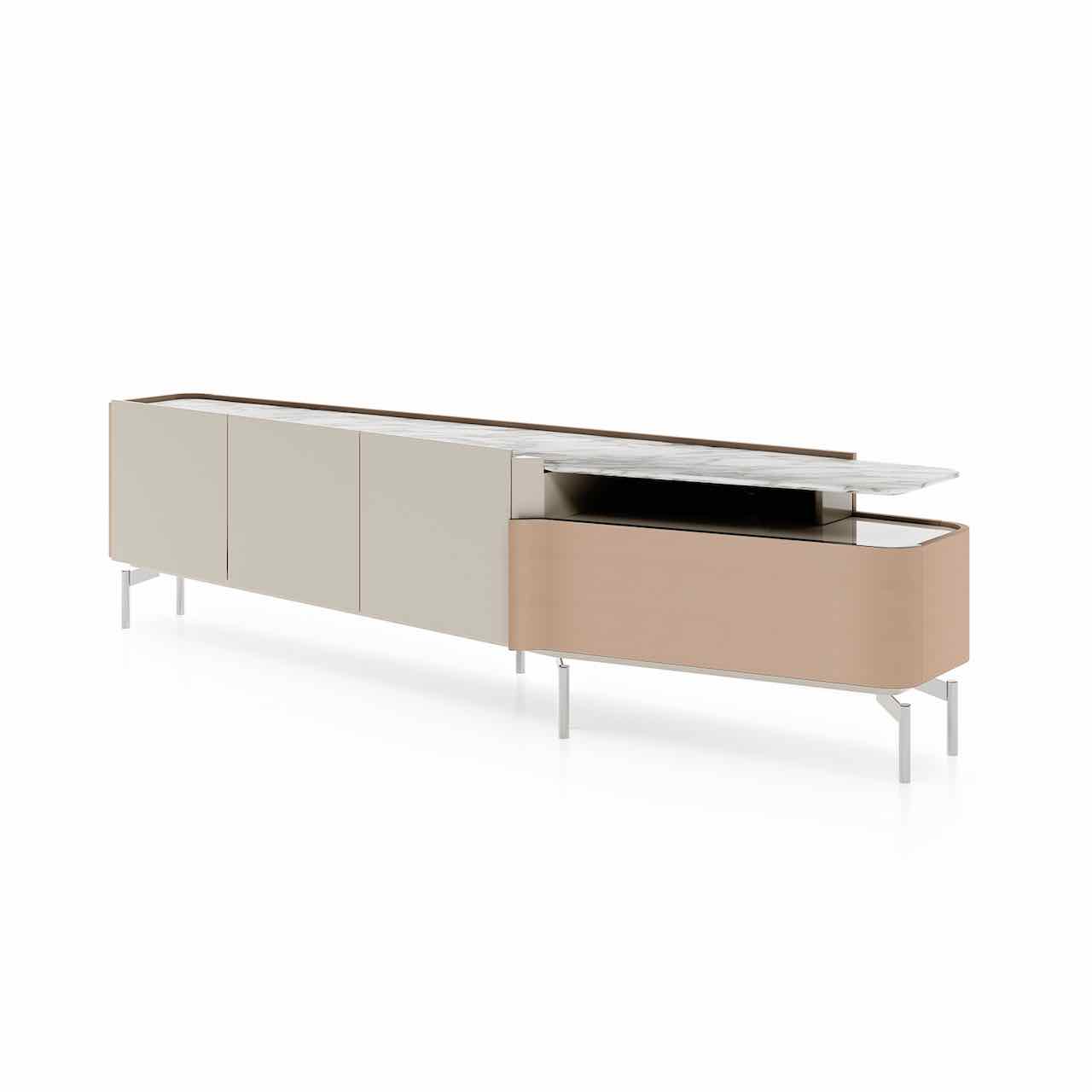 L’attento equilibrio nella sovrapposizione di piani torna protagonista del nuovo mobile contenitore, perfettamente coordinato alla nota credenza. Anche in questo caso, infatti, sottili e leggeri piedini in metallo sostengono un’avvolgente struttura in legno, rivestita in pelle. La continuità delle tre ante in legno laccato lucido, leggermente più alte del top così da agevolarne la presa, è ‘interrotta’ dal fianco più sinuoso del mobile: qui un cassetto basso e curvato, sempre rivestito in pelle e rifinito da un elegante profilo in metallo cromo, crea uno spazioso ripiano a giorno sotto il top.