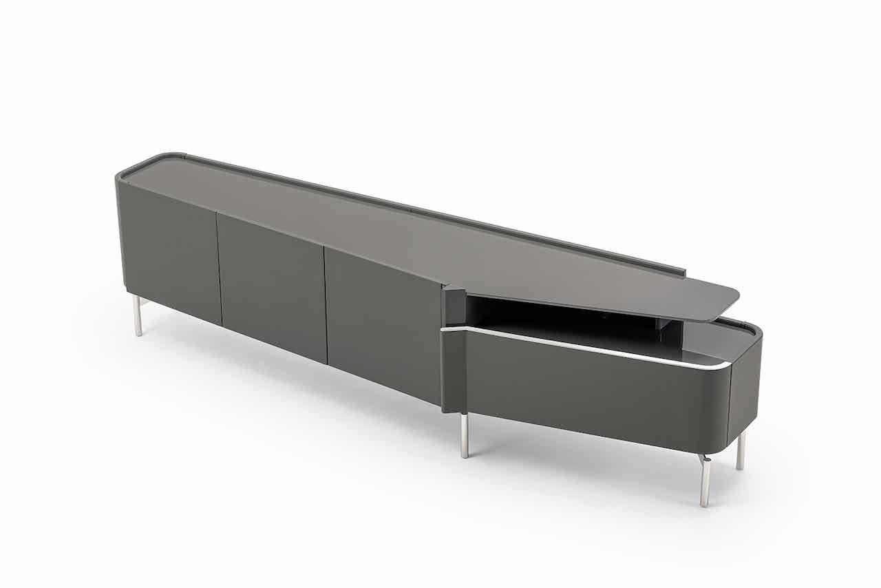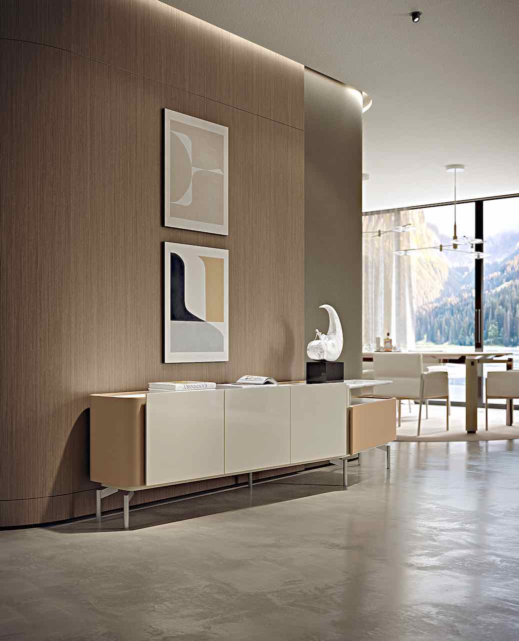 L’attento equilibrio nella sovrapposizione di piani torna protagonista del nuovo mobile contenitore, perfettamente coordinato alla nota credenza. Anche in questo caso, infatti, sottili e leggeri piedini in metallo sostengono un’avvolgente struttura in legno, rivestita in pelle. La continuità delle tre ante in legno laccato lucido, leggermente più alte del top così da agevolarne la presa, è ‘interrotta’ dal fianco più sinuoso del mobile: qui un cassetto basso e curvato, sempre rivestito in pelle e rifinito da un elegante profilo in metallo cromo, crea uno spazioso ripiano a giorno sotto il top.