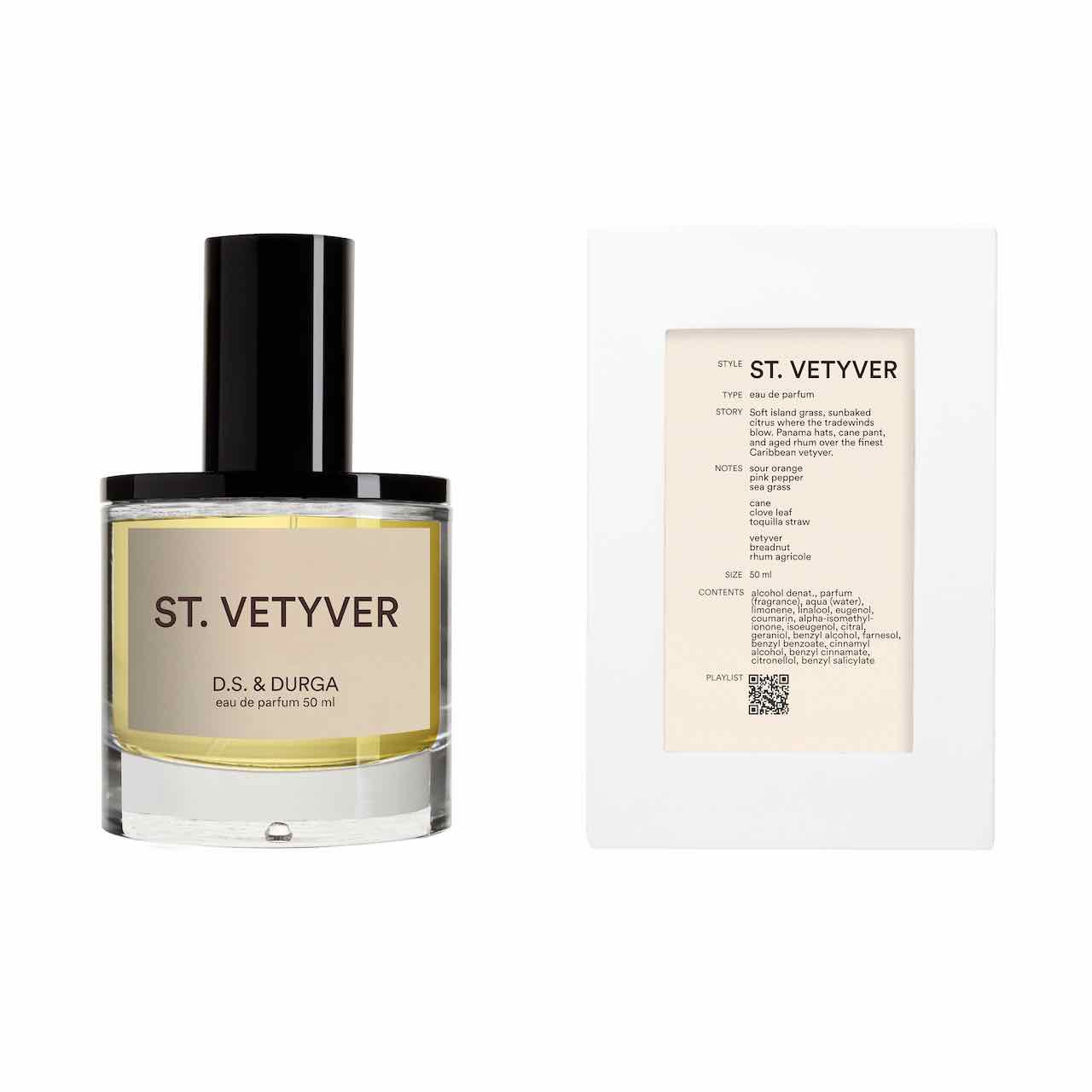 D.S. & Durga presenta un’elegante interpretazione del vetiver immerso tra piante e oggetti caraibici: ST. VETYVER. Un profumo che rende omaggio alle celebri acque di colonia dei marinai e degli amanti del mare. Il puro distillato di vetiver di Haiti invecchiato si sposa delicatamente con le dolci note del bambù e quelle più speziate del rum. Fresche note di erba e limoni tropicali completano questo profumo sinfonico ed elegante.