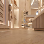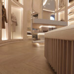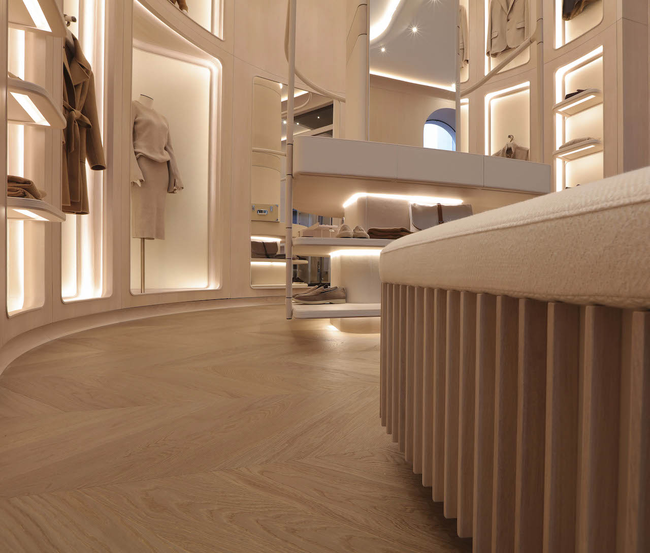 Il primo piano, in cui domina l’acero, è uno spazio esclusivamente dedicato all’abbigliamento donna con la suite che all’occorrenza diventa camerino di prova. Inoltre, vi è lo spazio dining con una cucina a scomparsa e lo spazio living con sofà, poltrone, un nuovo modello di libreria domotica e una boiserie artistica.