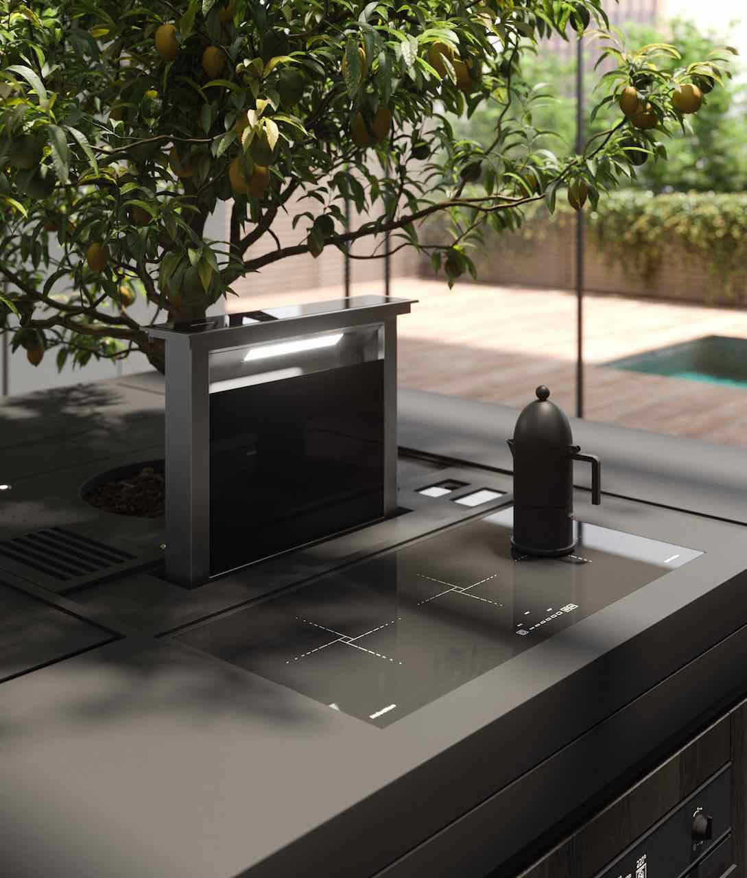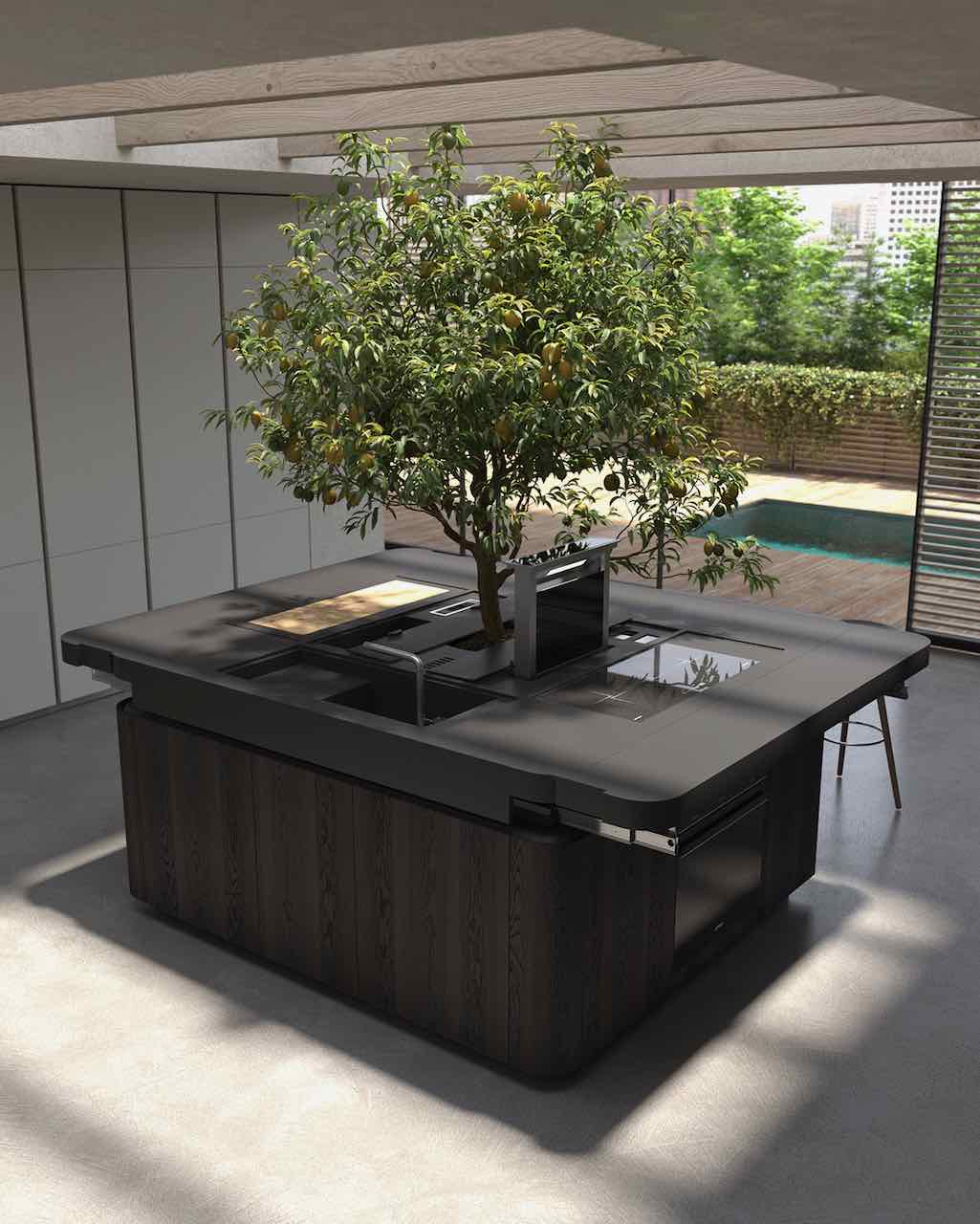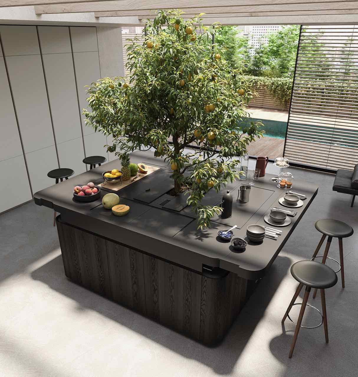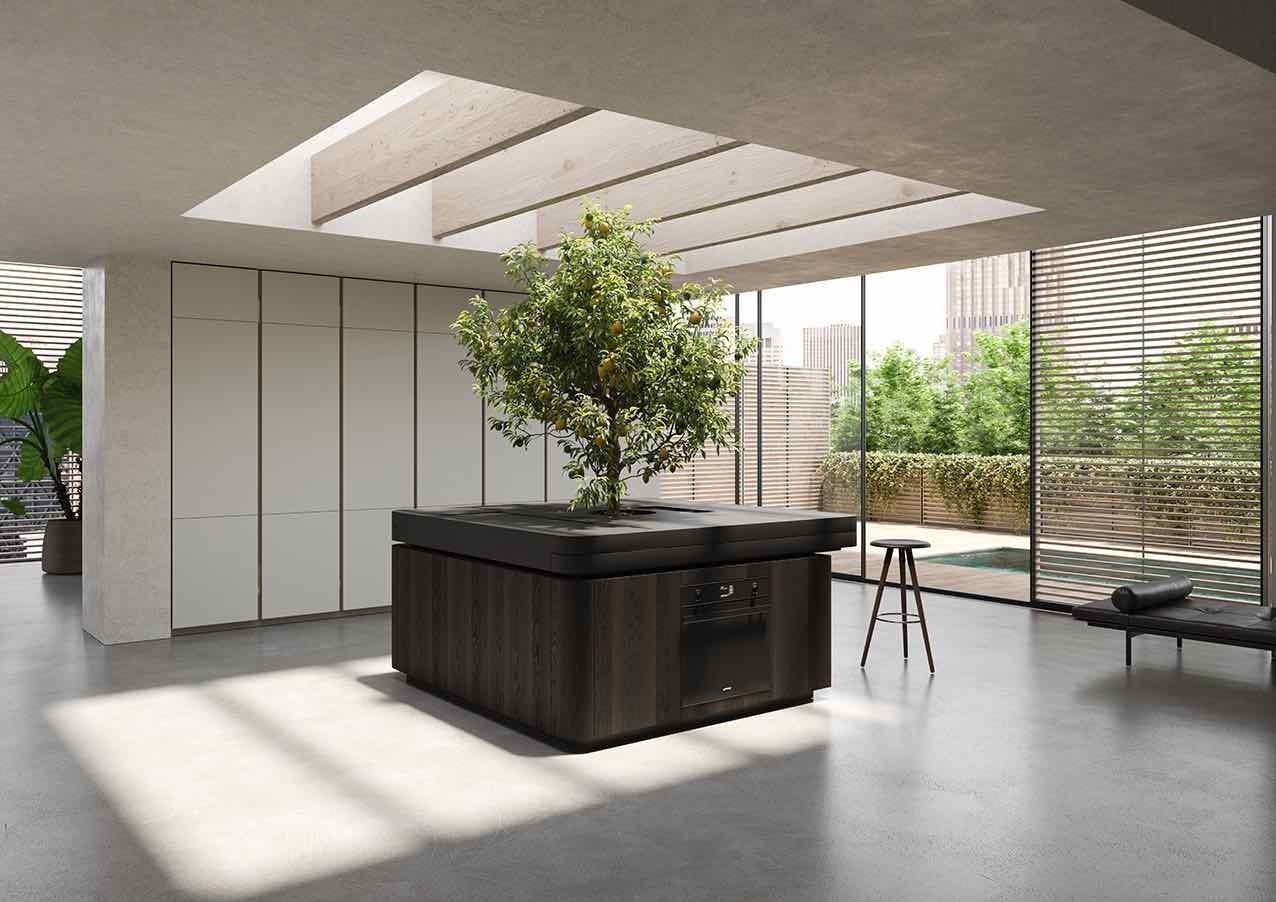 Tratto distintivo del modello è un albero, posto al centro di un’isola. L’essenzialità del design riesce a celare la straordinaria ricerca, dal punto di vista dell’innovazione e della tecnologia, che ha permesso di rendere multifunzione il monoblocco che costituisce la cucina. Seguendo il principio della circolarità, è possibile ruotare intorno alla cellula free-standing ed espletare tutte le fasi di trattamento del cibo, dalla conservazione alla preparazione, fino al consumo e al riciclo. Il top, grazie allo scorrimento di due ‘ali’, si amplia trasformandosi in tavolo da pranzo, così da favorire la convivialità. Sfruttando lo spazio interno di tutto l’impianto, invece, sono stati ricavati vani contenitivi per la dispensa, per gli elettrodomestici, e per un sistema di irrigazione che