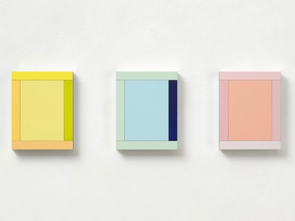 Pittura Colore Spazio si apre con l’opera monumentale LUEB go 1276w (2013), forma in alluminio i cui confini sono attraversati da listelli gialli, azzurri e neri. A rappresentare gli anni Novanta invece un’opera della serie DIN II (1994), composta da quattro elementi rettangolari che si susseguono nell’alternanza dei colori primari, e la famosa Kinderstern(1994), la stella dei bambini. Alcuni esemplari delle celebri edizioni intitolate Face (2016) – in cui bande di puro colore sono stratificate in un avvicendamento emotivo e strutturale – e i piccoli An Meine Grüne Seite (2007) e Tafel (2016), che, come altarini cromatici, scandiscono in maniera netta e lineare la poetica percettiva del maestro tedesco.