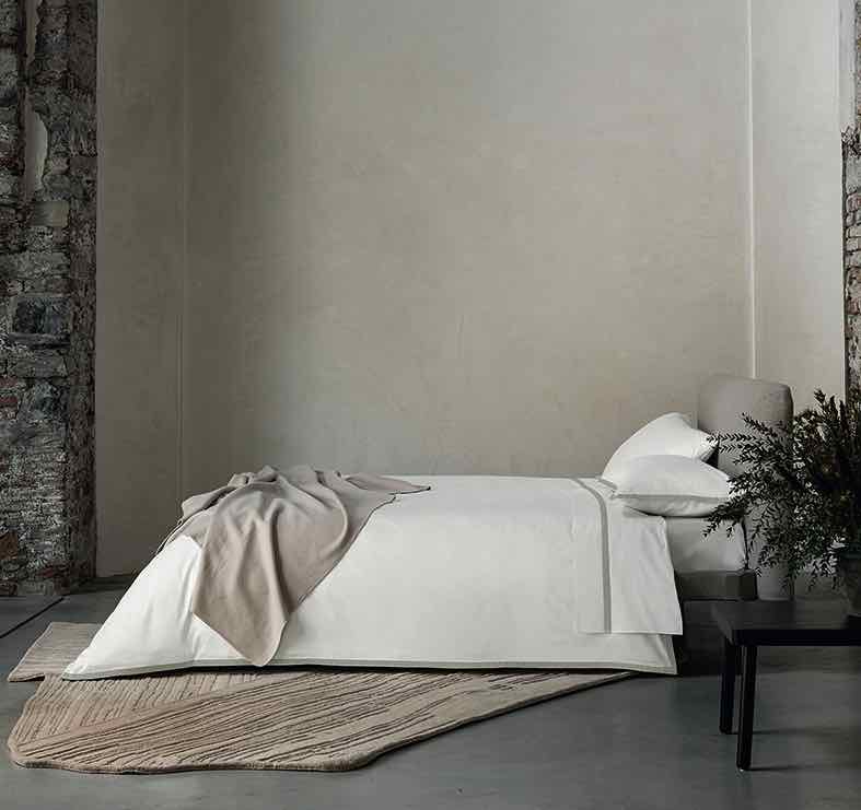 La componente eco-sostenibile è intrinseca nel bianco: si definisce anche nell’assenza di tinture e nella conseguente riduzione dell’impatto ambientale. Le superfici immacolate dialogano con delicati colori naturali, morbidi e attraenti, come i grigi e i toni pastello proposti in una versione lattiginosa: una spruzzata di zucchero smorza le coloriture, un velo di neve copre le disegnature per poi lasciare intravedere, qua e là, segni scuri che regalano profondità alla biancheria da letto.