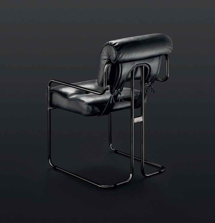 La struttura è in tubolare d’acciaio cromato, con un effetto di continuità nelle linee e grande comodità nella seduta. I cuscini di schienale e seduta sono rivestiti in pelle, e collegati tra loro tramite due larghe cinghie di cuoio.