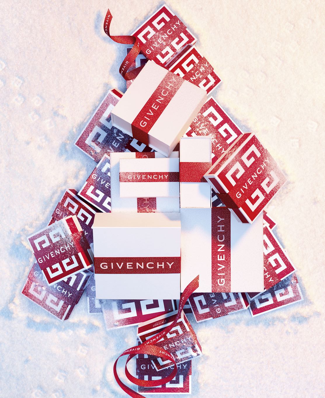 Le confezioni, stampate su cartoncino effetto mat impreziosite da fiocchi di neve di velluto delicato al tatto, sono impreziosite da un nastro glittetrato nella versione femminile e da un logo Givenchy in argento nella versione maschile e sono state progettate per ridurre la quantità di carta e plastica necessaria.