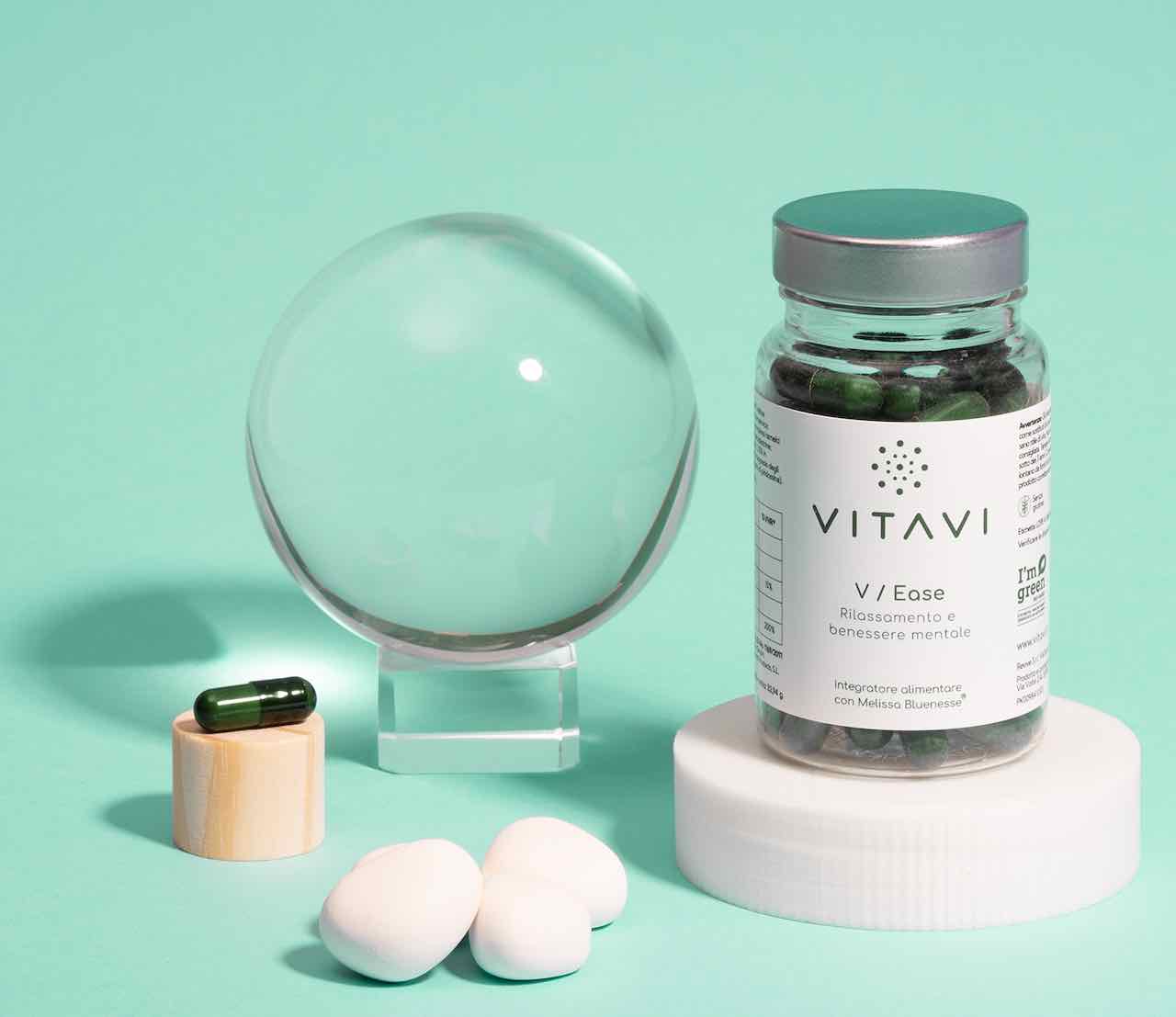 La ricerca scientifica promossa dal marchio VitaVi ha creato l’Integratore alimentare V/Ease, ideale per favorire il rilassamento, il benessere mentale e coadiuvare il normale tono dell’umore. V/Ease vanta una formula esclusiva che contiene 5 ingredienti ad alto dosaggio mirati e selezionati, di cui 3 marchi registrati con ricerche specifiche pubblicate a supporto : Melissa Bluenesse®, Zafferano affron®, Magnesio bisglicinato da Albion Minerals®, Vitamina B6 e Triptofano.