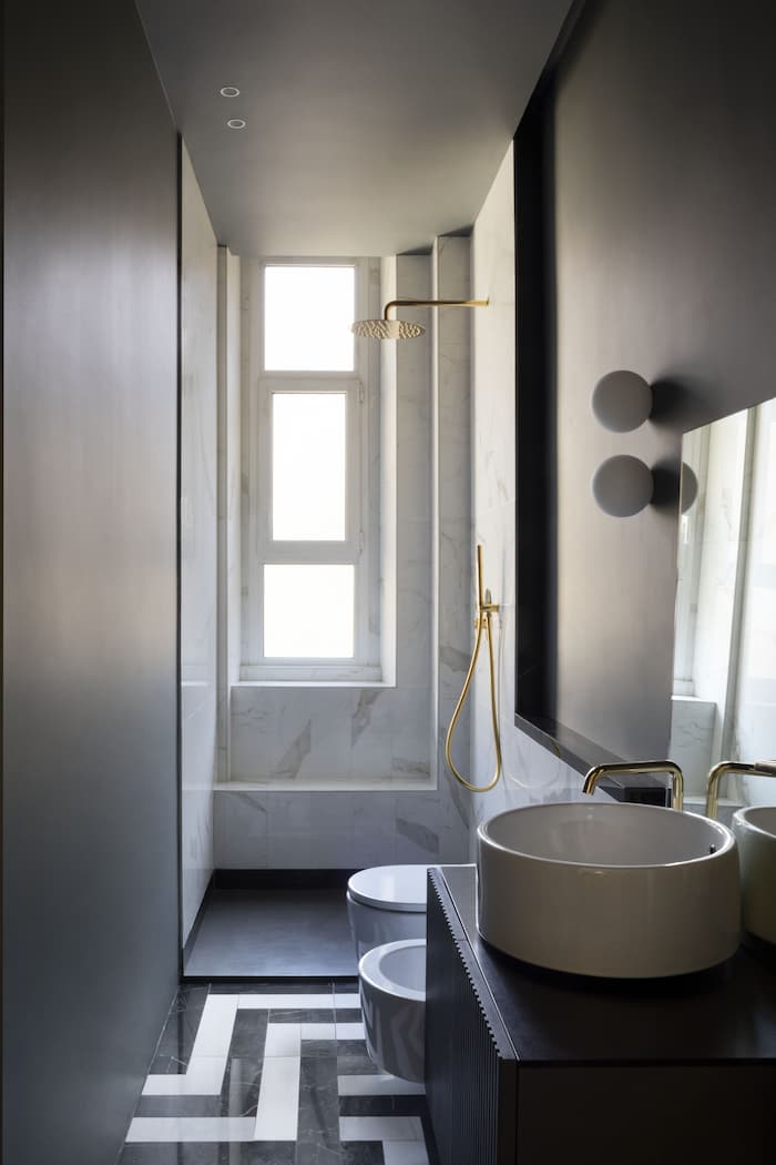 Il bagno, con la spaziosa doccia finestrata, utilizza le piastrelle in gres porcellanato di Atlas Concorde, tagliate e modificate su disegno di Dainelli Studio creando un decoro ad hoc per il progetto.