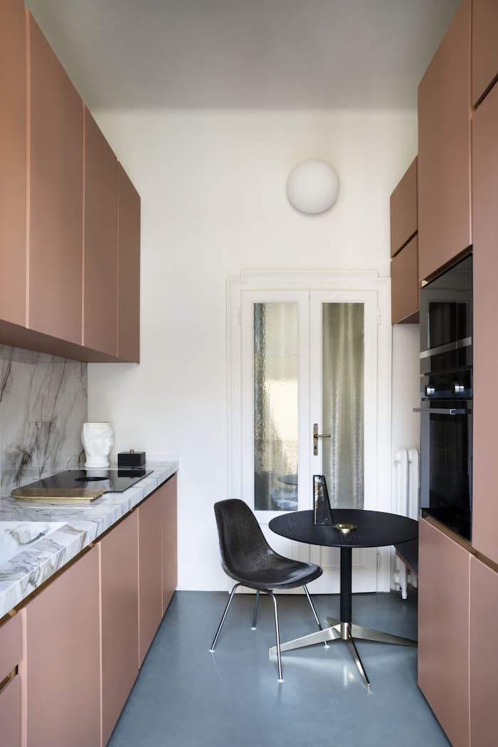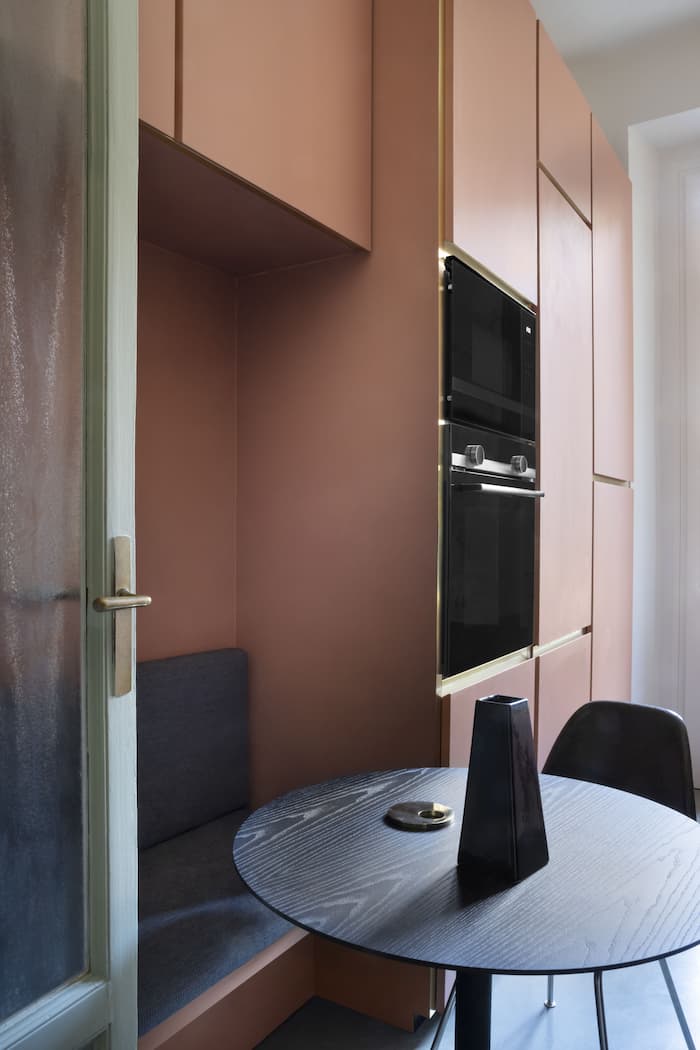 Il corallo dom24ina invece la cucina, dove Dainelli Studio ha voluto ricreare un’atmosfera che è una raffinata combinazione tra le cucine americane anni Cinquanta e un richiamo ai bistrot francesi, particolarmente evidente nell’elemento della panca in legno. Il pavimento è in resina, mentre la cucina è stata realizzata in MDF resinato e accosta il rosa a dettagli in ottone ed un effetto marmo con importanti venature grigio scuro e ambra. Ad impreziosire ulteriormente lo spazio, le rubinetterie firmate Artis (così come quelle del bagno) sono state scelte nella variante oro lucido.