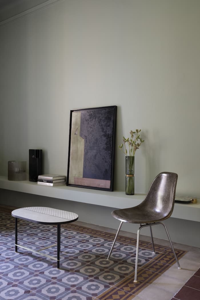 Ingresso e zona living hanno come colore dominante il verde salvia, utilizzato sia per le pareti che per le boiserie contenitive cannettate. Nel salotto, spiccano il morbido divano Elissa e la poltroncina Lilas, disegnati da Dainelli Studio per Gallotti&Radice, affiancati dal coffee table Cookies in legno Tweed e dalla lampada Bonfire dello stesso brand. A completare lo spazio, lampade vintage, un dipinto di Leonardo Dainelli della collezione Faces e un’eclettica opera pop rinascimentale del proprietario.