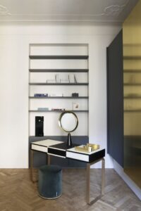 La camera da letto si apre sull’ampia armadiatura su misura, pensata per essere sia contenitore che decoro grazie alle ante centrali in ottone e all’effetto sospeso che la rende quasi aerea. I sontuosi stucchi immacolati che incorniciano il soffitto vengono resi contemporanei grazie all’utilizzo del legno di frassino tinto nero per la testiera del letto e nella boiserie e dalla scelta degli arredi: la lampada Dioscuri di Artemide, il tavolino Clemo e lo scrittoio-vanity Selene, in Taba Frisè bianco e Tanganika nero, entrambi Gallotti&Radice.