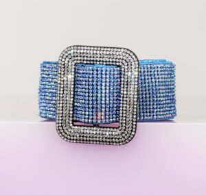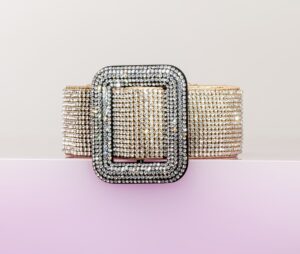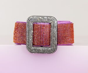 La Venus Belt è la cintura che regala un colore per ogni sfumatura del fascino femminile e nasce dalle abili mani degli artigiani di Caprarola, una fabbrica immersa nei boschi nel cuore della Tuscia dove arte e maestria dialogano incessantemente. Qui un piccolo gruppo di giovani artigiani guidati da Benedetta e dal fratello Agostino cura meticolosamente ogni borsa e, in questo caso, ricoprono una cintura di seta con una scintillante maglia metallica di cristalli.