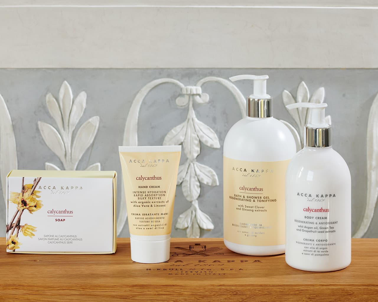 La linea Calycanthus è disponibile anche in preziosi cofanetti ideali per un cadeau natalizio che parli di benessere ed eleganza senza tempo, il mondo Acca Kappa in una confezione-regalo che scalda il cuore anche quando fuori si gela.