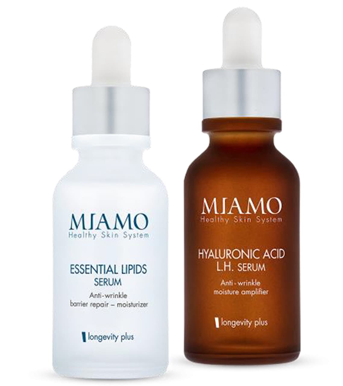 Perdita di acqua e l’alterazione dell’integrità della barriera cutanea sono tra le cause principali della disidratazione della pelle. Per rispondere alle esigenze della cute secca, Miamo propone un binomio straordinario: due sieri che mixati garantiscono risultati potenziatiripristinando il film idrolipidico e restituendo alla pelle la sua naturale idratazione ed elasticità: ESSENTIAL LIPIDS SERUM LONGEVITY PLUS e HYALURONIC ACID L.H. SERUM LONGEVITY PLUS.