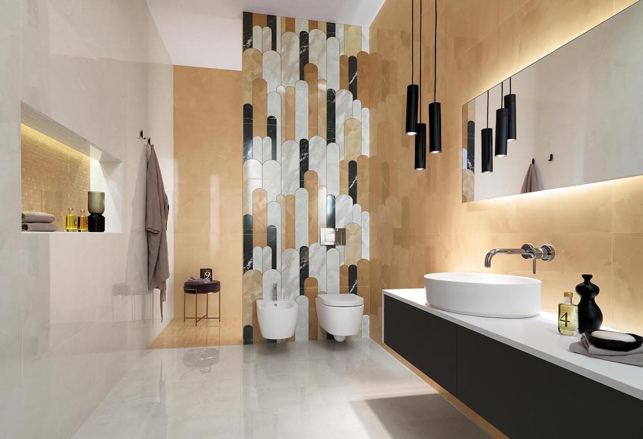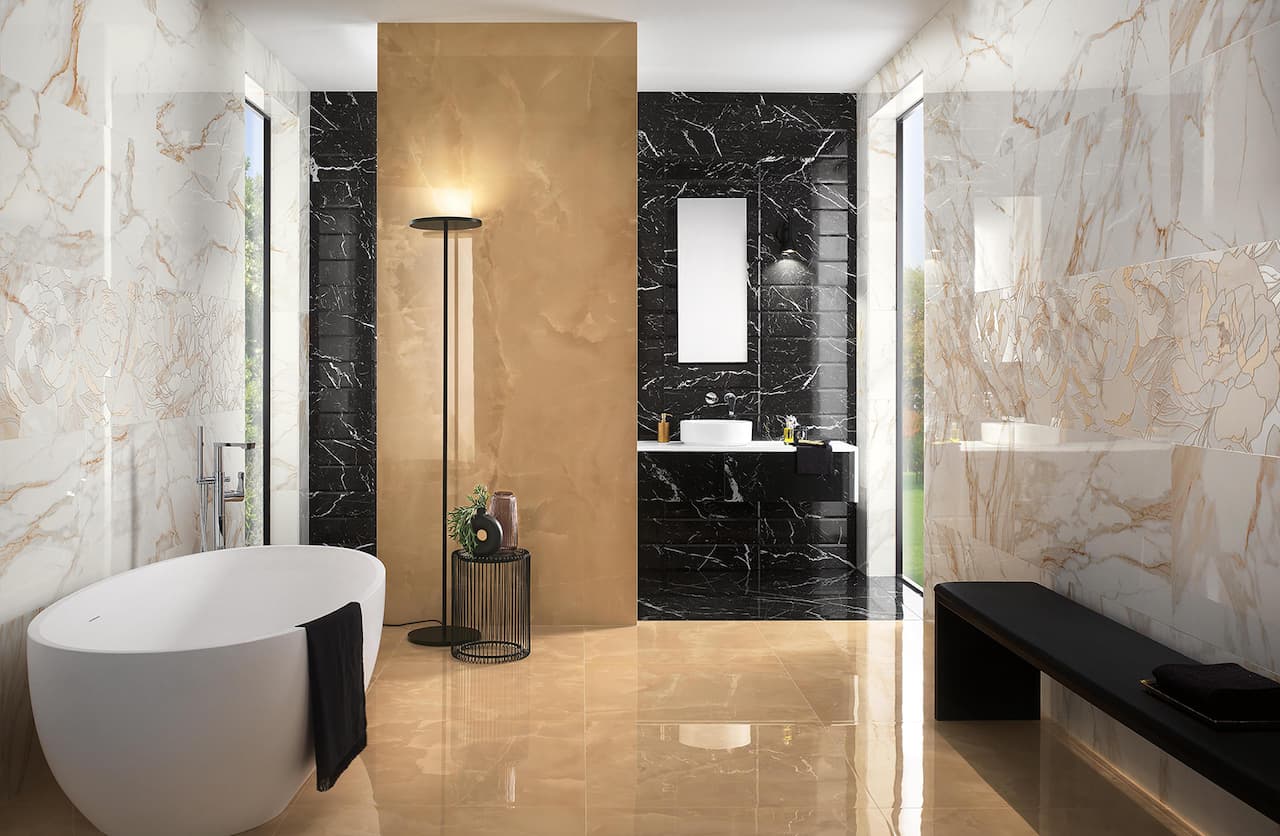 Il richiamo alla natura si trova poi ancora negli inserti Flower e Safari, elementi scenografici e lussuosi in grande formato che creano sequenze in profondità sia negli ampi spazi sia per creare quinte e corridoi negli ambienti più contenuti. Nella collezione riecheggia l’art déco attraverso l’Inserto Archs e il Mosaico Archs, decori architettonici dominati dal tema dell’arco come espressione della perfetta fusione di forme, colori e sfumature che percorre Roma Gold. Lo stesso motivo è ripreso nella maxi-lastra di Inserto City, nel formato 120×278 cm. Un linguaggio moderno – quello di Roma Gold – che distilla il meglio del classico per adattarsi a contesti contemporanei esclusivi, sofisticati ma anche caldi e accoglienti, per esaudire sogni di bellezza sia nel residenziale sia negli spazi contract e commerciali o ancora nei luoghi dedicati all’accoglienza e al benessere, come hotel, spa e wellness resort.