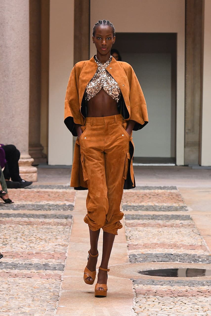 I suit all’apparenza essenziali nelle loro forme fluide e scivolate svelano tagli verticali nelle giacche e spacchi nel pantaloni per volumi nuovi e inaspettati che rubano la scena. Quasi minimali, i completi in pelle cruelty free doppiata per un effetto corposo ma leggerissimo, rispecchiano il concetto di “sport couture” caro al marchio, – un modo di vestire versatile, disinvolto, ma speciale, che si traduce anche nei morbidissimi caban in suede e nelle anorak super colorate, in una palette di verde smeraldo, giallo e rosa, che aggiungono un tocco street e divertente alla collezione.
