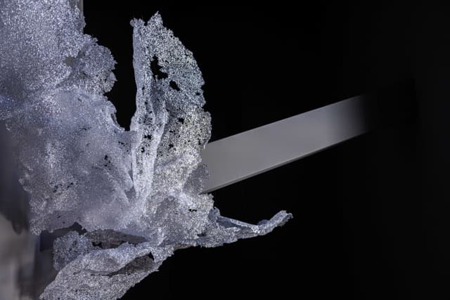 La ricerca di Poppi è sensuale e materica, capace di generare sensazioni tattili grazie all’utilizzo di materiali sintetici e la loro interazione con la luce. Giulia è rimasta affascinata dalla preziosità e cangianza dei granuli plastici di PETG vergine, materiale che l’azienda lavora per realizzare la sua vasta gamma di contenitori, e ha dato vita ad un’installazione ambientale (Sffsssshh) appositamente creata per gli spazi aziendali.
