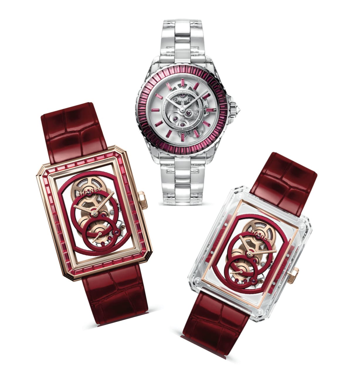 Nel 2020, in occasione del 20° anniversario di J12, CHANEL punta sulla trasparenza e presenta il J12 X-RAY, la cui cassa e tutte le maglie del bracciale sono state tagliate in zaffiro cristallo grezzo. Nel 2022, la J12 X-RAY Edition Rouge svela le sue curve così come quelle della sua movimento. La silhouette del J12 rimane la stessa, ma il colore rosso dominante firma della Maison CHANEL, gli conferisce un aspetto più contrastante. Simboli di vita e passione, i rubini sottolineano il carattere inimitabile e raffinato di questo segnatempo. Il suo movimento si presenta sotto forma di pizzo, grafica, ricamato con ponti edi pignoni, secondo le regole dell’arte dell’Alta Orologeria. I pignoni Calibre 3 sono ancora presenti, ma i ponti scompaiono ingegnosamente grazie al vetro zaffiro. Questo modello esibisce la cassa in cristallo zaffiro, lunetta fissa in oro bianco con 46 rubini taglio baguette, corona svitata in oro bianco con diamante taglio brillante, quadrante in vetro zaffiro con i 12 indici incastonati di rubini taglio baguette e bracciale in vetro zaffiro con tripla chiusura pieghevole e due maglie in oro bianco con 34 rubini taglio baguette.Calibro 3.1: Movimento di manifattura, movimento a carica meccanica manuale, con ponte del timer, piastra principale e ponte del treno di ingranaggi in vetro zaffiro. Riserva di carica di circa 55 ore e frequenza di 28.800 oscillazioni all’ora. Edizione numerata e limitata di 12 pezzi.