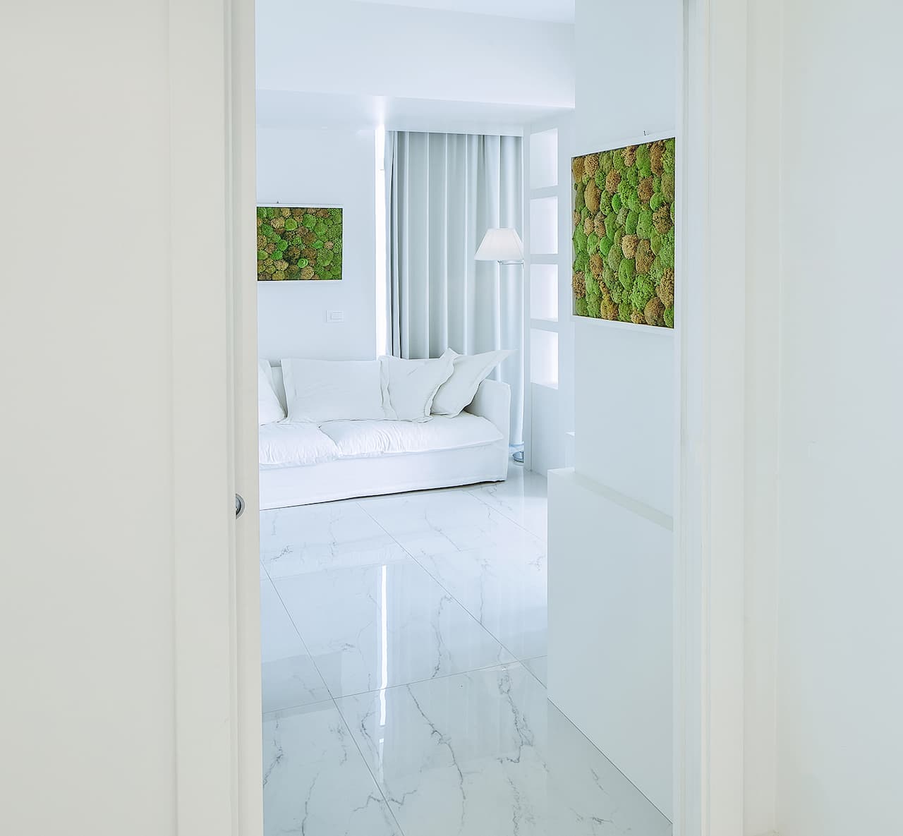 Caratterizzato da delicate striature che riproducono con assoluta fedeltà le eleganti venature marmoree, il gres porcellanato effetto marmo Elements Lux con finitura lappata Lincoln è stato utilizzato per i rivestimenti di pavimenti e pareti, donando all’ambiente un tocco minimal e sofisticato allo stesso tempo. Al fine di dare un tocco di modernità agli interni delle camere, sono stati invece utilizzati diversi formati della serie di gres porcellanato effetto resina matt di Elements Design nella tonalità White. La serie, ispirata alle grandi metropoli internazionali, è infatti concepita per dare agli spazi architettonici un tocco di glamour contemporaneo.