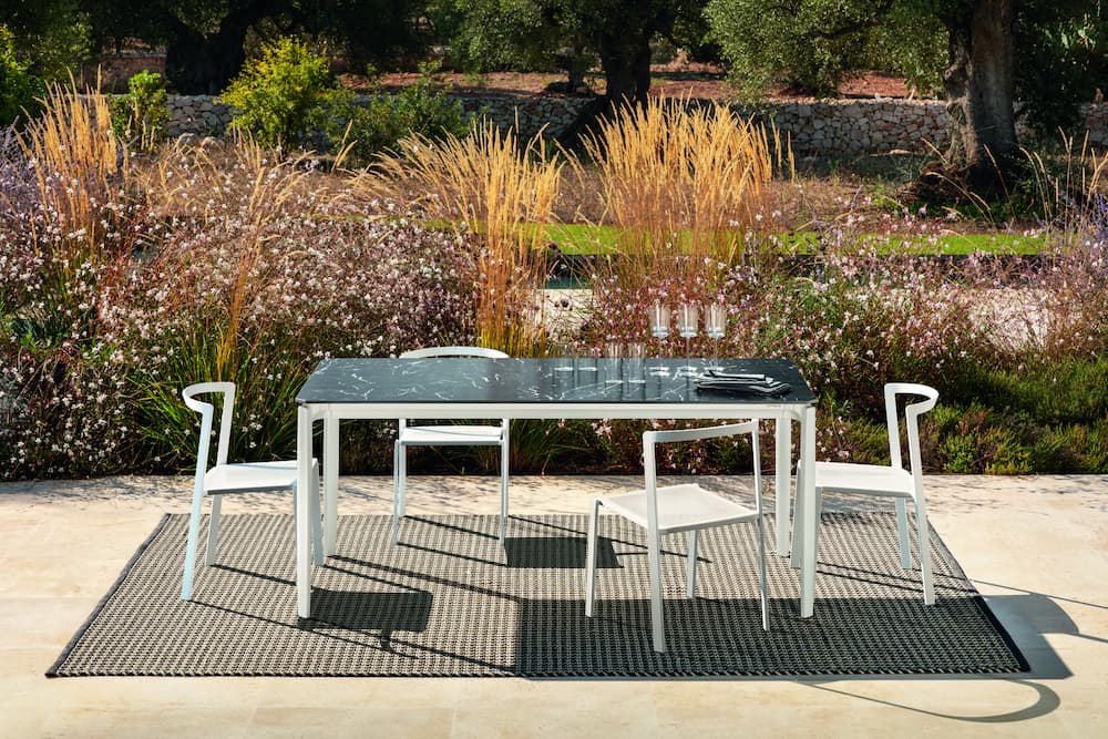 Spazio dunque a top in gres, disponibili in numerose finiture, e a strutture leggere e caratterizzate da uno stile ben definito: la particolare gamba in alluminio dal taglio stondato e obliquo, infatti, è il fil rouge di tutta la collezione, fatta eccezione per la versione con top tondo, caratterizzata da un intreccio di tondini in alluminio che creano un seducente effetto visivo.