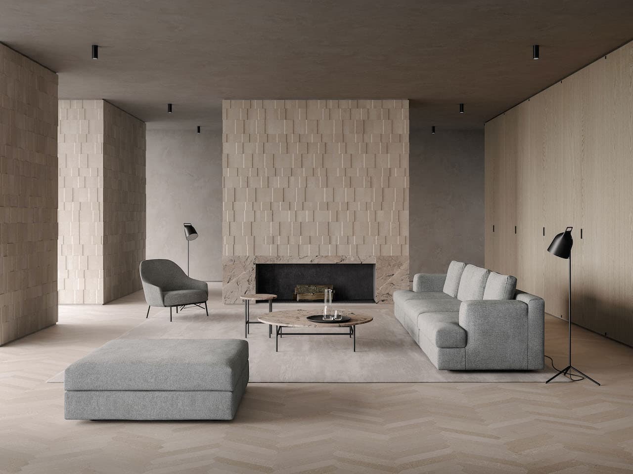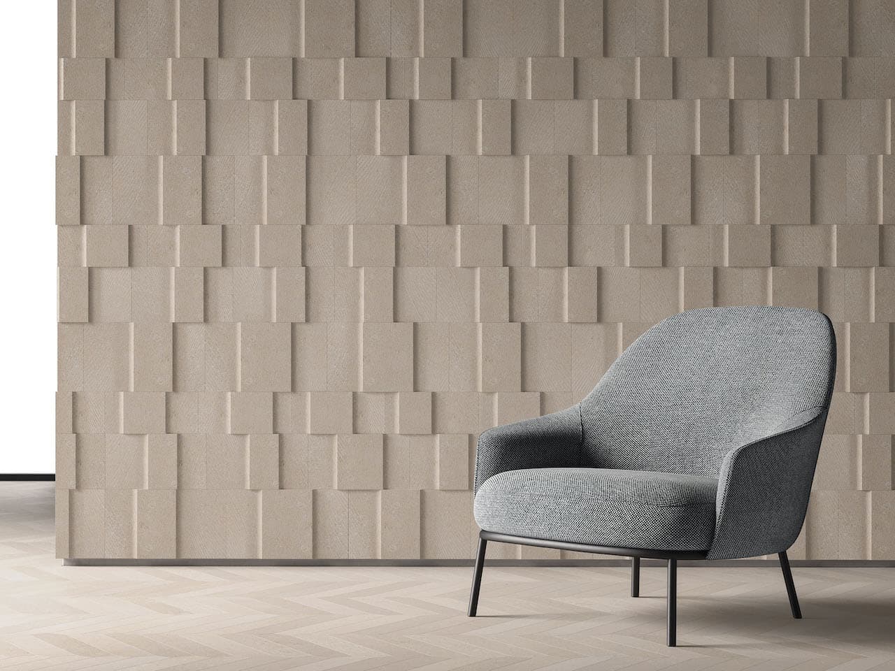 Bump è un rivestimento realizzato con scarti di lavorazione di Pietra di Vicenza progettato su un approccio concettuale in equilibrio tra motivo decorativo, profondità e finiture. Protagonista del design è un quadrilatero di diverse dimensioni che si ripete all’infinito, in modo solo apparentemente casuale, su piani prospettici differenti e su una dicotomia di texture che donano un forte effetto materico.