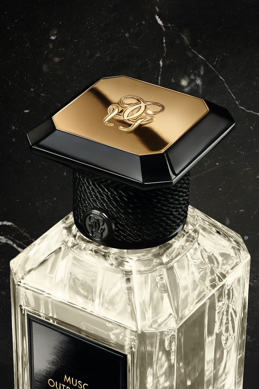 Celebrazione dell’arte del design e della personalizzazione secondo Guerlain, il tappo del flacone è decorato con una finitura nera in tessuto intrecciato e coronato da una targhetta dorata con la doppia G del logo. Infatti, per sottolineare l’anima statuaria della nuova composizione, Guerlain ha chiesto all’artista parigina Anne Lopez, scultrice del bianco ed esperta di materiali, di immaginare e realizzare completamente a mano, una targhetta speciale per il flacone della nuova collezione. Lasciandosi ispirare dalla scia di Musc Outreblanc, Anne Lopez ha creato una serie di pezzi unici con uno stucco immacolato punteggiato di foglia d’oro, come un delicato fiore che germoglia dalla pietra…