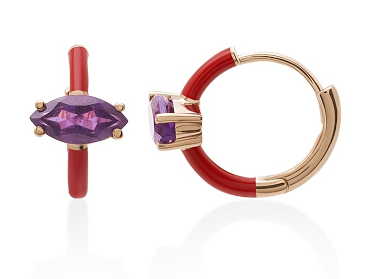 Il gioco si fa più intenso nell’anello a quattro file con l’alternarsi di anelli in oro rosa con piccole pietre, rubini rossi e ametiste, a quelle ricoperte di smalto rosso e viola. Completano e arricchiscono il look gli orecchini a cerchio dove lo smalto rosso ricopre i piccoli cerchi per combinarsi nuovamente con l’ametista.