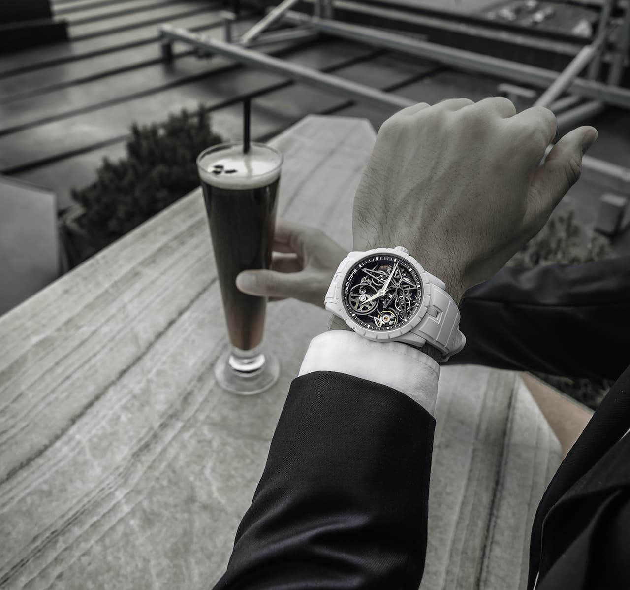 Ispirato a materiali simili impiegati nell’industria aerospaziale, l’MCF dosa leggerezza e rigidità per valorizzare il segnatempo facendone una nuova opera d’arte, con cassa, lunetta e corona realizzate in questo materiale high-tech di un bianco purissimo. L’MCF, simbolo della maestria tecnica della Maison e del suo desiderio di spingersi sempre oltre, è composto al 99,9% di silice ed è realizzato ricorrendo al processo Sheet Molding Compound (SMC) che permette di sperimentare liberamente nuove possibilità e di creare design complessi grazie alla sua struttura resistente nonché 2,5 volte più leggera della ceramica e del 13% più leggera del carbonio SMC. Costruito per risultare estremamente comodo al polso, senza dimenticare l’importanza di un’estetica ricercata, questo materiale è stato specificamente sviluppato da Roger Dubuis per rimanere stabile e garantire una resistenza elevata ai raggi UV, così come alla luce naturale e a quella artificiale, mentre l’aggiunta di pigmenti ne ha accentuato il candore. Per mantenere un aspetto total white, il look di questo orologio decisamente sorprendente è completato da un cinturino in caucciù bianco.