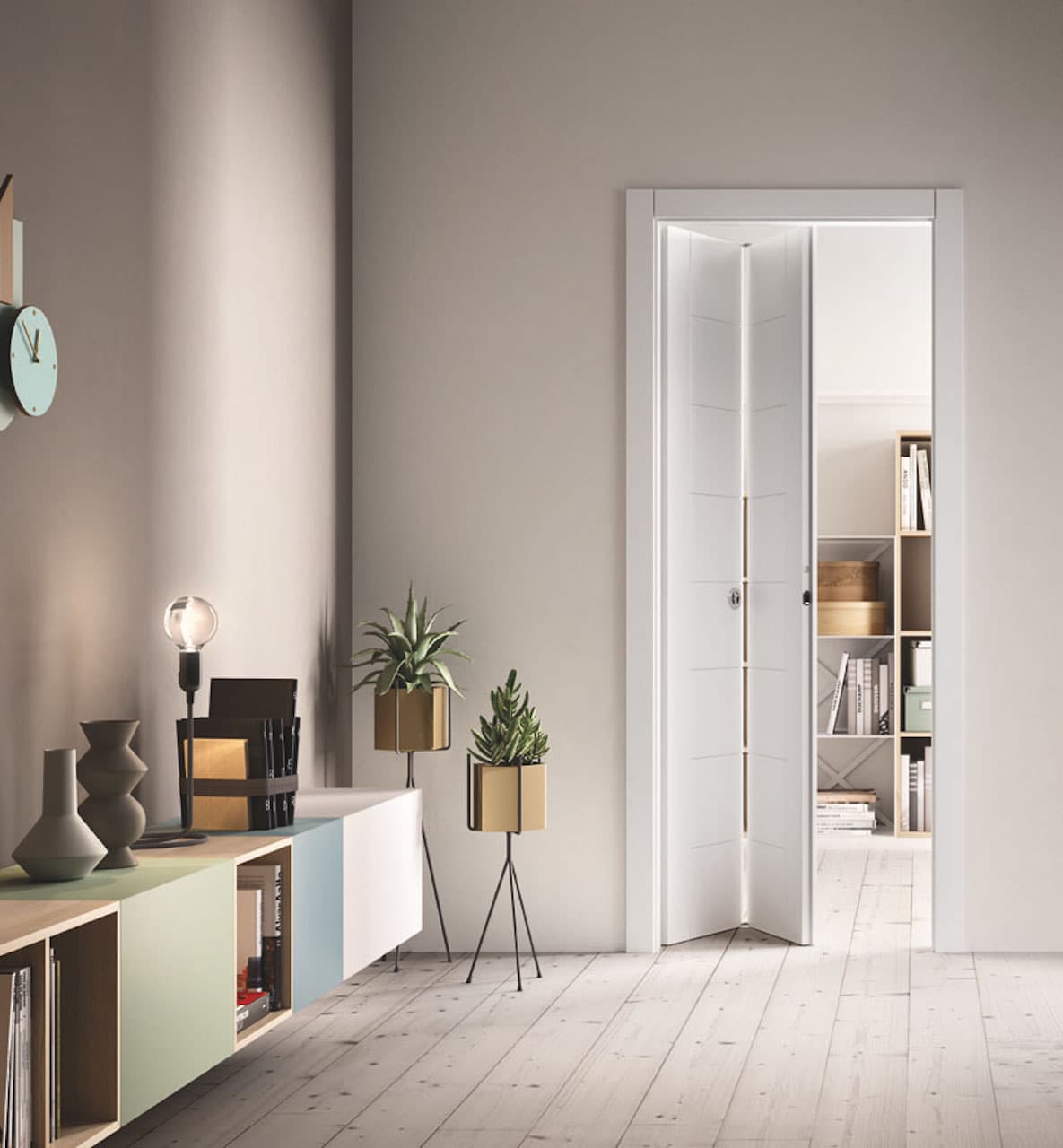 Quando gli spazi e i passaggi sono tanto stretti da non ospitare una porta a battente e la parete non abbastanza lunga per una scorrevole, le soluzioni proposte da Ferrerolegno sono Modula e Indue, entrambe con ante pieghevoli che coniugano performance ed estetica.