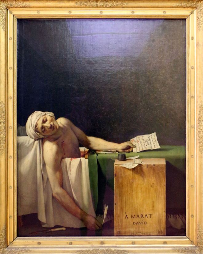 Il quadro La morte di Marat, spesso chiamato anche Marat assassinato, narra le vicende di Jean-Paul Marat, uno svizzero trapiantato in Francia durante il periodo della Rivoluzione Francese. In quel periodo era un giornalista molto attivo tanto che fondò il giornale “L’amico del popolo” nel quale era solito sottolineare la sua posizione politica e decisamente sanguinaria. Secondo lui il popolo doveva ribellarsi ai girondini, cosa che avvenne tanto da formare un governo giacobino.