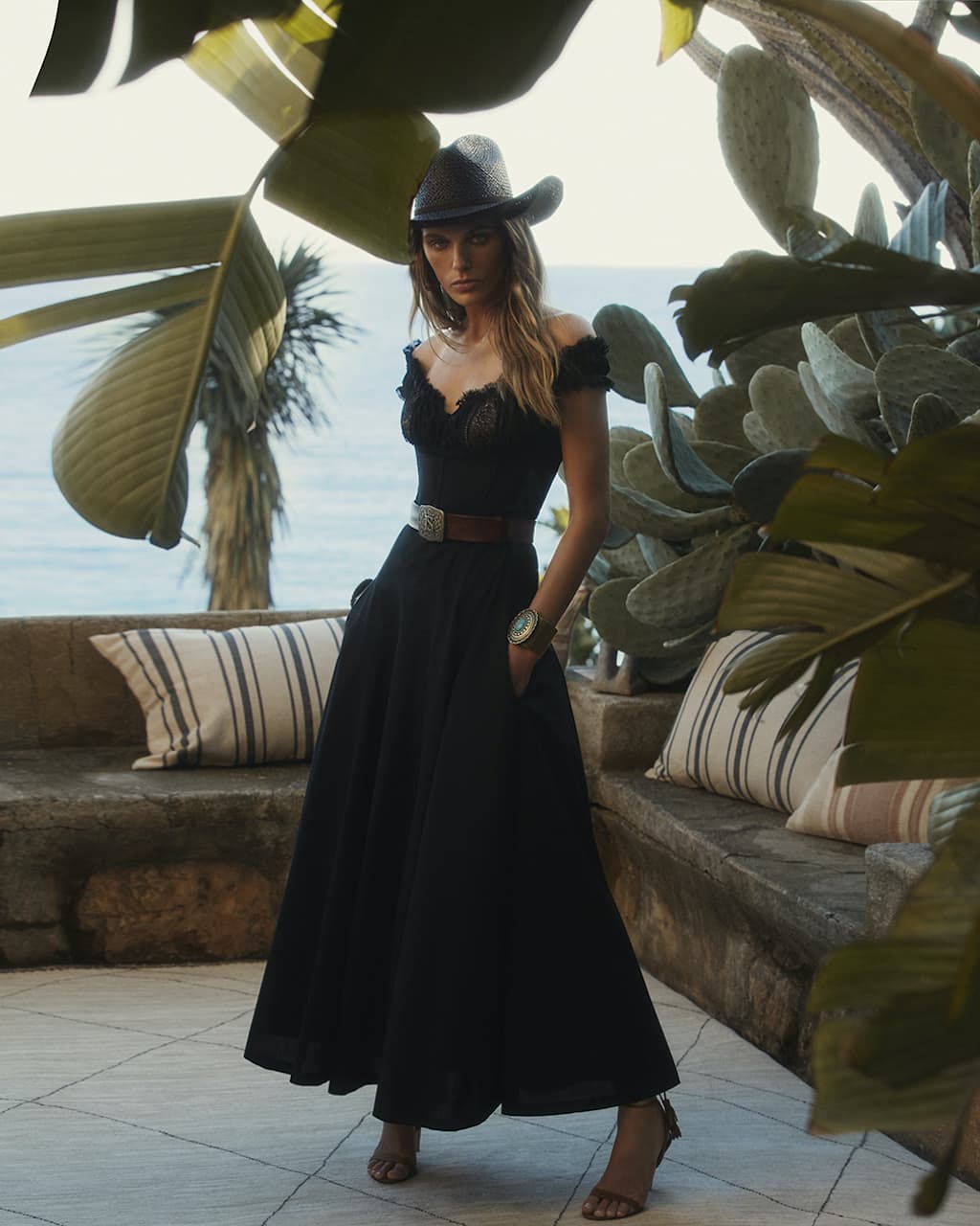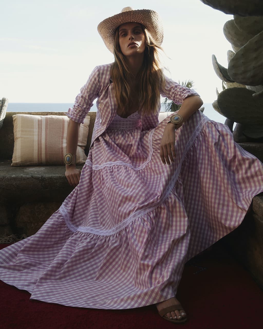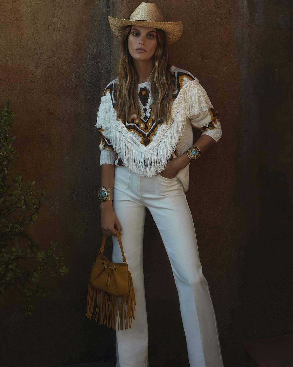 La modella protagonista della campagna diventa una cowgirl 4.0 tra la vegetazione desertica e le carezze del vento dell’estate. Un gioco di sguardi tra lei e la camera, una seduzione che si gioca sul filo dello stile. Le bluse di cotone garzato dai delicati ricami à jour si completano grazie a maxi skirt di suéde profilate da cascate di frange Navajo, frange che ritroviamo anche di maglia a decorare pull jacquard, e nelle giacche rodeo. Le camicie di chiffon dal taglio maschile si portano con gonne dai volumi ampi e trasparenti oppure stampate, ma si aprono sempre su corsetti stile lingerie; i maxi abiti alternano un’allure country ad una più sensuale, grazie agli scolli femminili. A fare capolino gli accessori: cowboy hat ma di rafia intrecciata, monili con castoni di turchesi, così come cesellate e preziose sono le fibbie delle cinture e le borse morbide con il logo a rilievo.