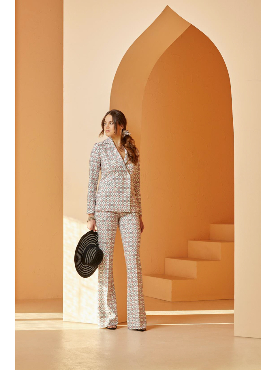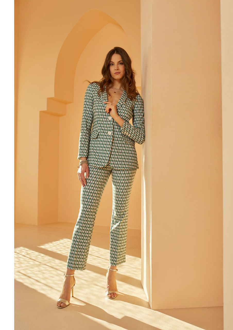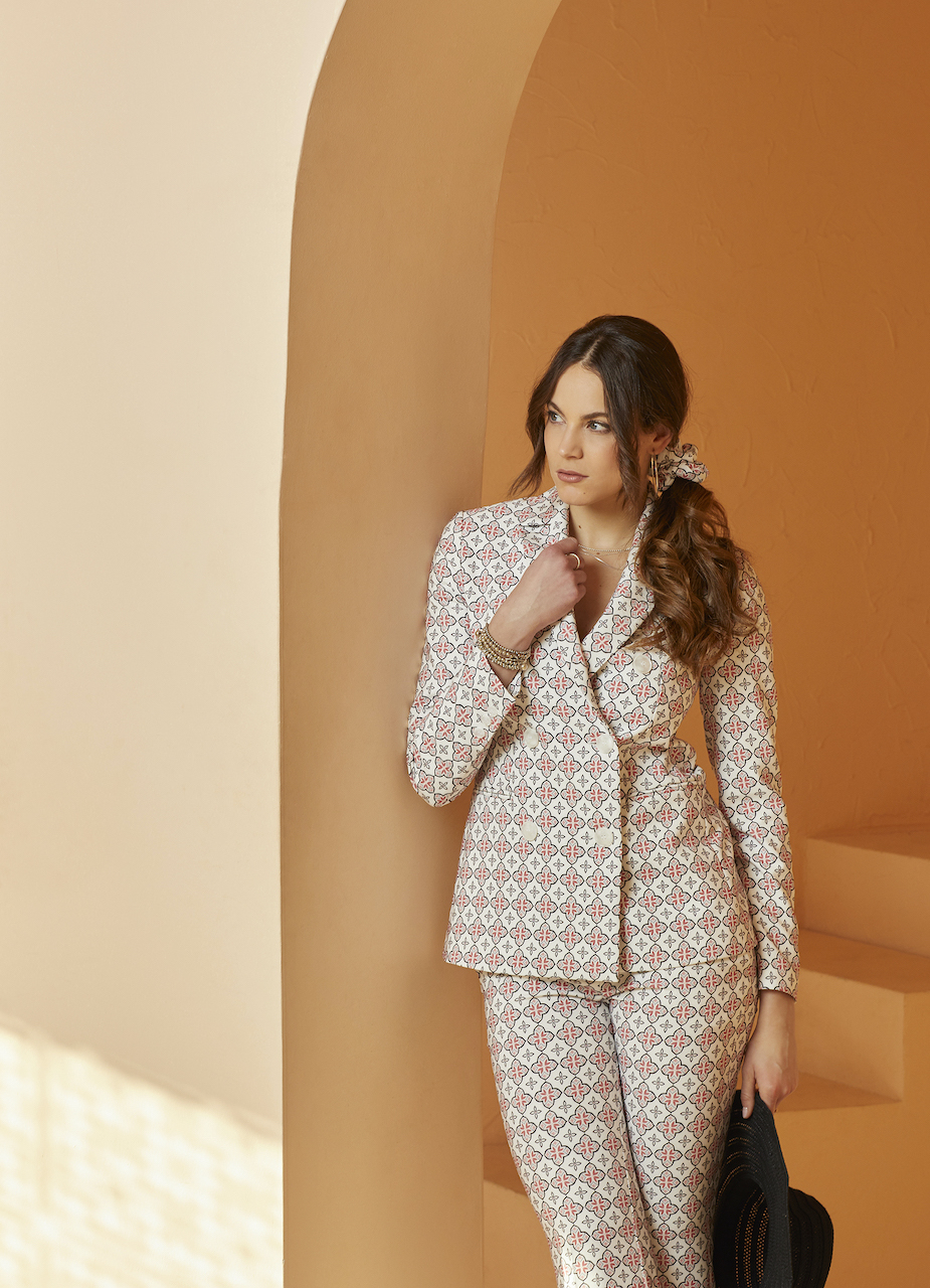 Il brand fondato dalla giovane Stefania Pelucchi Post Scriptum è specializzato in tailleur, all’apparenza un capo lontano dall’idea di estate e libertà. Eppure i suoi non sono tailleur qualsiasi ma sogni possibili, esclusivi e inclusivi, che puntano sulla qualità e non sulla quantità, su tagli sartoriali ed esecuzione a regola d’arte a opera di maestranze artigiane che cuciono a mano ogni pezzo, su personalizzazioni su misura, su vestibilità minuziose (la designer realizza di suo pugno i cartamodelli adatti a donne di ogni forma ed età) e, infine, su tessuti ricercati e stampe esclusive. Una di queste, la più evocativa, la più intrigante, la più allegra, la più desiderabile, è proprio la stampa effetto maiolica sul tailleur doppiopetto, con la giacca che si appoggia sui fianchi segnando appena il punto vita e i pantaloni tagliati sopra la caviglia, che slanciano ogni silhouette e donano davvero a tutte.