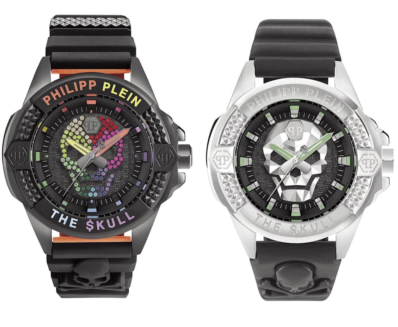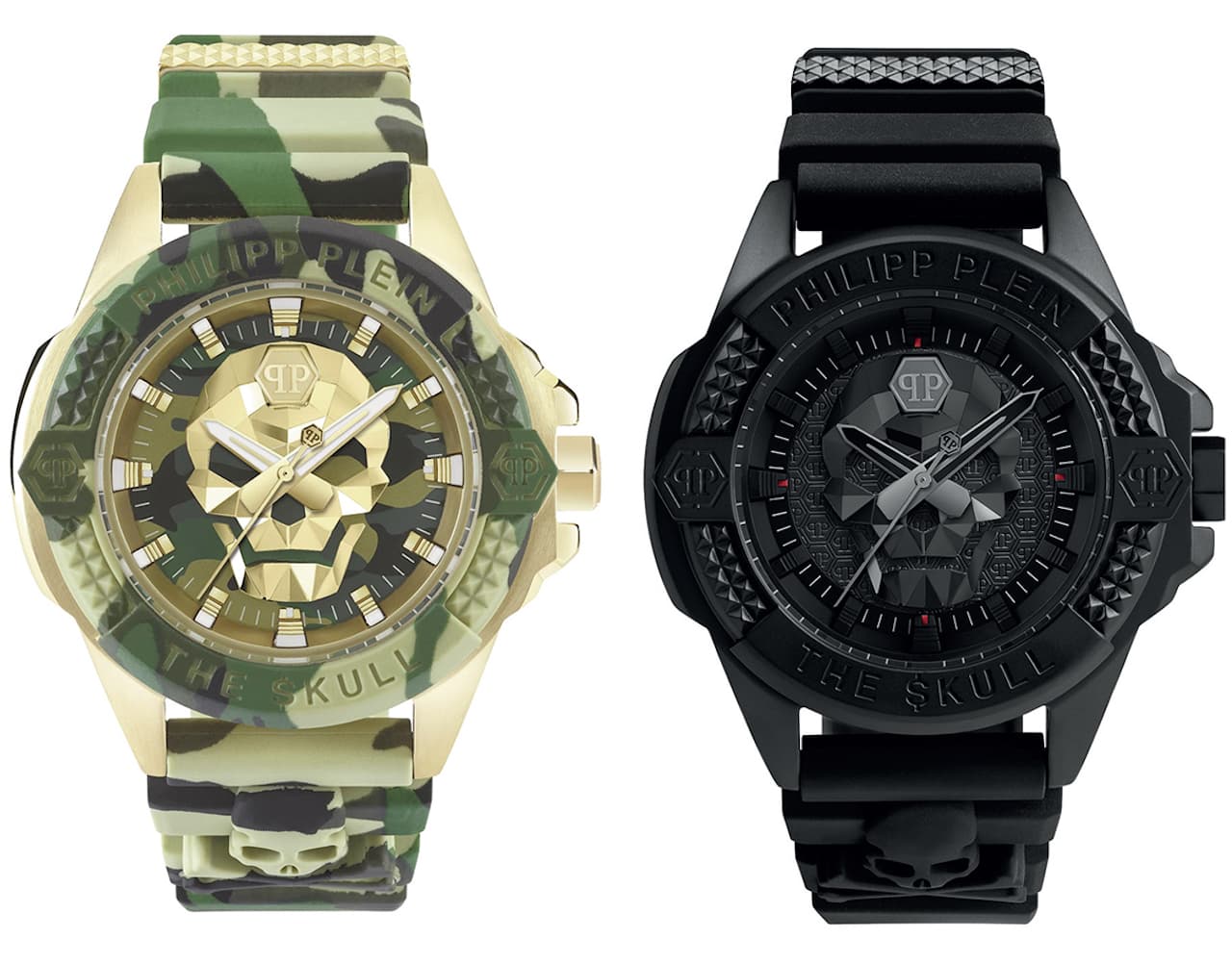Il camouflage caratterizza il cinturino e la cassa di due modelli del segnatempo (rotonda Ø 44 x 49.50 mm), nella tonalità verde chiaro con $kull color oro giallo e nella versione verde scuro, con $kull nero e dettagli verdi sul quadrante. I modelli con pavé di cristalli sono proposti nella versione con pietre multicolore oppure argento. Il logo Philipp Plein è inciso sulla lunetta borchiata alle ore 12. Due loghi esagonali con doppia P e il nome della collezione alle ore 6 sottolineano l’identità che distingue The $kull.