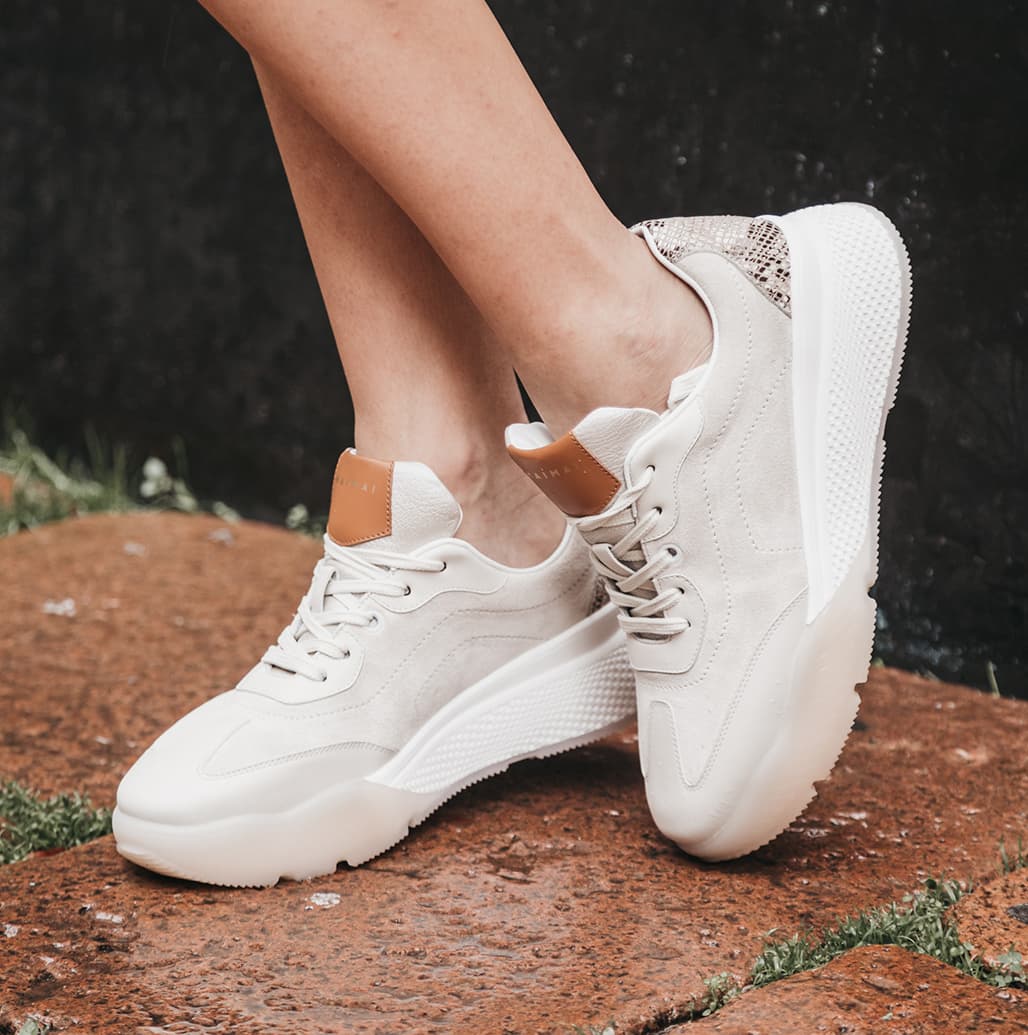 Il design delle Route Offwhite Pyton – forma affusolata e peso piuma – è evidentemente sportivo, con l’alta suola oversize scolpita il Eva Extralight leggerissima in bianco e quarzo trasparente con dettagli fashion e ricercati. La tomaia combina ad arte suede e pelle color ghiaccio, si arricchisce di una linguetta color cuoio e, a sorpresa, di un inserto sul tallone stampa pitone. Un mix cromatico e materico eccezionale, seppur delicato, che definisce le sneakers ideali per correre verso la primavera.