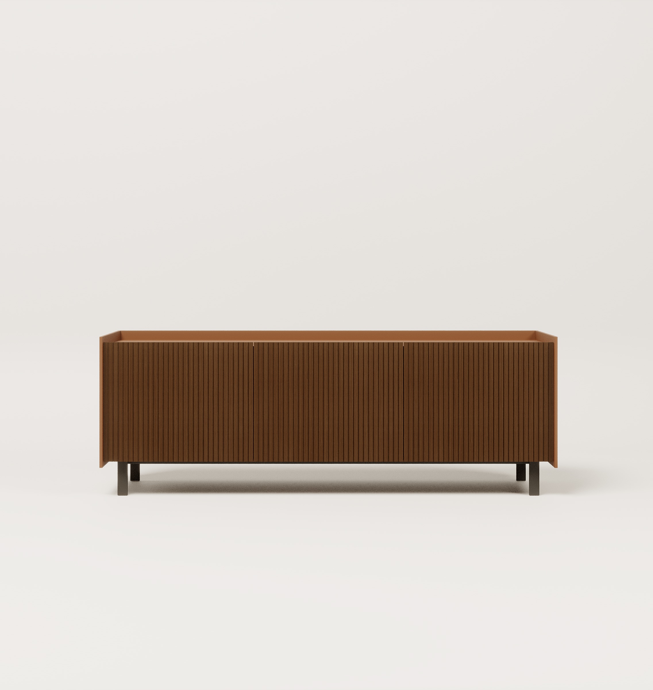 Il progetto di Danilo Fedeli gioca con i volumi, tra aggiunte e sottrazioni, accentuandoli con accostamenti materici tra legno naturale e colori laccati. Le ante fresate, realizzate in massellino di legno, sono incorniciate da fianchi laccati che ne delimitano il volume con effetto di alzatina perimetrale ed il trucco tecnologico del montaggio con un sistema a calamita. Gli elementi contenitivi poggiano su una struttura in metallo verniciata a colore.