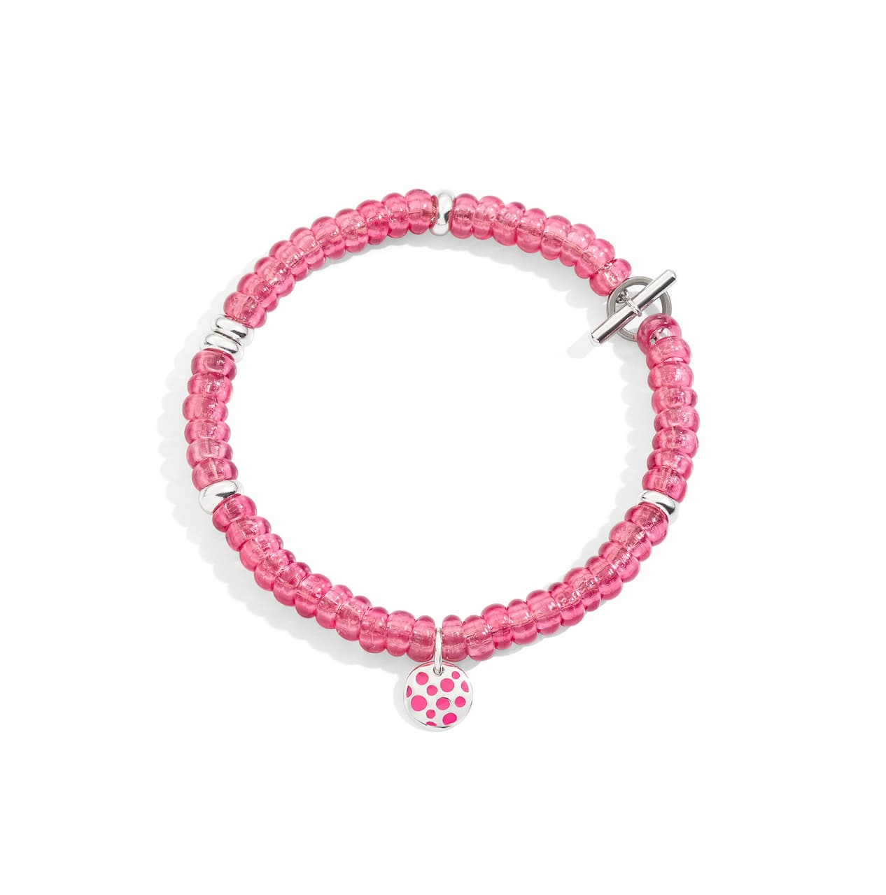 Realizzato nei toni del rosa con rondelle in plastica riciclata, intervallate da dettagli in argento, il bracciale rivela una piastrina in argento con pois a smalto. Un accessorio per vivere l’estate con energia e per contribuire alla salvaguardia del Pianeta; un dettaglio distintivo della community VeraLab.
