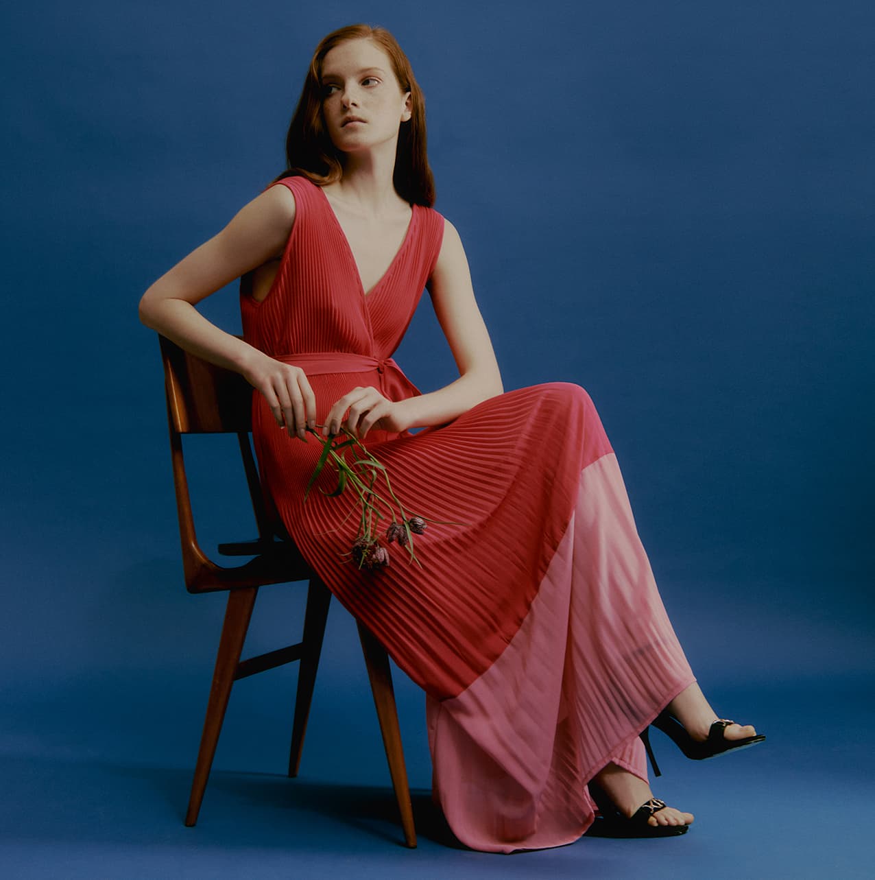 Portrait of a Lady, uno dei temi che ha ispirato la collezione, eterogeneo nella palette cromatica ma coerente nell’idea, offre una femminilità rarefatta, a tratti leziosa e dal sapore vagamento retro, la stessa allure riportata nell’immaginario contemporaneo da Bridgerton. Ai colori brillanti del corallo e dell’ottanio fa da contraltare l’indole delicata del nude pastello. Il georgette viscosa apre le danze, declinando il tessuto in tre tipologie di abiti: l’attenzione si sposta da un mini dress con un profondo scollo a V e una gonna a ruota a un abito midi con schiena scollata e gonna asimmetrica, per poi concludere con un maxi dress con maniche ad aletta e fiocco sullo scollo. Per un’occasione all day long, Motivi ha pensato nella stessa variante tessuto un pantalone palazzo con camicia abbinata.