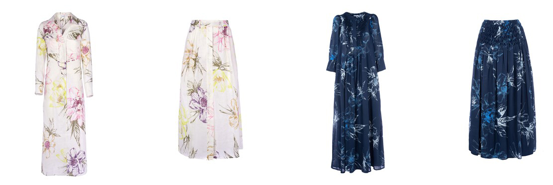 Abito (€ 630,00) e gonna (€ 380,00) in lino con stampa floreale pastello. Abito (€ 740,00) e gonna (€ 490,00) in cotone e lino con stampa floreale blu. La plissettatura sullo scollo dell’abito e sulla vita della gonna è realizzata a mano dalle esperte artigiane di Malo.