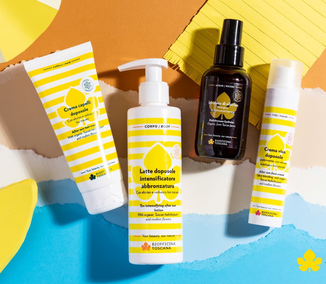 Biofficina Toscana propone una nuova linea di cosmetici after sun a base di Elicriso e Verbasco bio toscani. Un toccasana per viso, corpo e capelli, che sublima l’abbronzatura con idratazione garantita e che protegge dal sale e dal sole per un effetto capelli sani. La linea composta da 3 prodotti Dopo Sole garantisce: