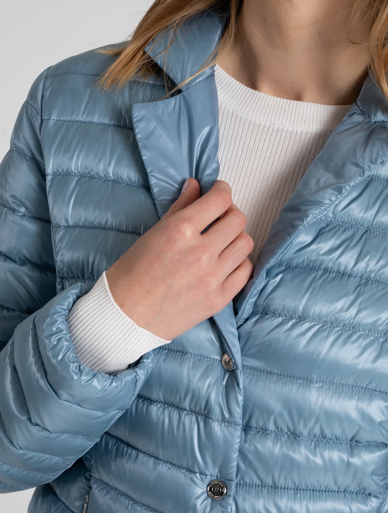 La lavorazione è leggerissima, proprio perché l’imbottitura top quality in 100% piumino light premium non è racchiusa nel tradizionale sacco. Tre dettagli – tra gli altri – regalano al piumino “Serina” un twist particolare: i revers, classici e discreti, i tre pratici bottoni automatici di metallo e le tasche verticali chiuse da zip, in nome di un mix armonioso tra sporty e sartoriale.