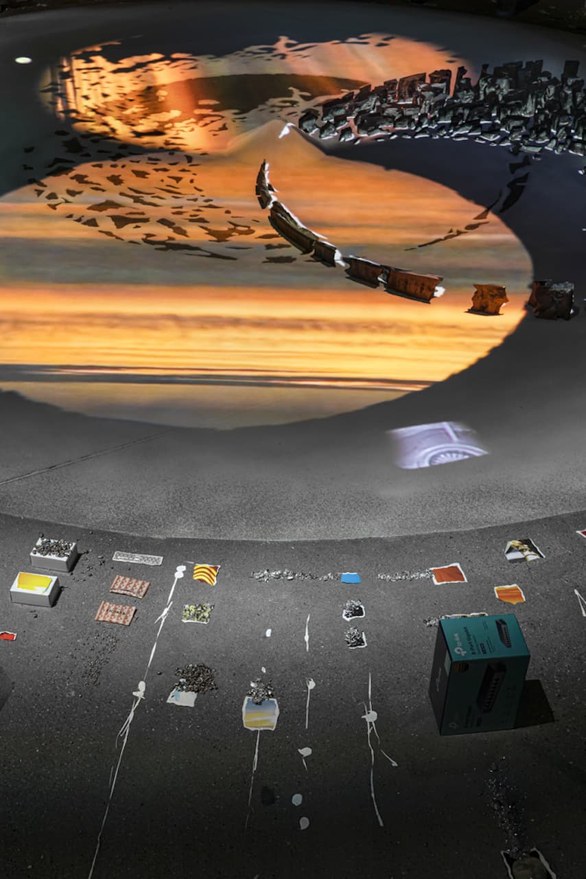 Il viaggio nel mondo reale comincia con un incontro fortuito. Una creatura bicefala, la scultura in ceramica Ring Master & Tics (2022) di Virgil Ortiz, accoglie i visitatori. L’artista mantiene viva la tradizione ceramica del Pueblo de Cochiti, raccontando le storie dei nativi americani e della loro rivolta, miscelandole con il proprio vissuto personale, fantascienza e tematiche apocalittiche. Da questo punto, il percorso prosegue attraverso una costante oscillazione tra realtà e immaginazione. La mostra continua con Man in a Boat(2002) di Ron Mueck: un uomo intraprende un viaggio ancestrale alla scoperta di sé e del mondo, ergendosi nudo sulla prua di una barca di legno, immerso in un’enigmatica contemplazione. Un’installazione sonora diffonde la voce di Patti Smith mentre legge il testo del matematico Misha Gromov The Four Mysteries of the World, a cui la cantante aggiunge un quinto mistero, quello della poesia. Percorrendo la mostra dal principio alla fine, assistiamo a una cronologia di albe ed eventi immortalati da Sho Shibuya in un rituale mattutino che mostra la reazione dell’arte alle notizie dal mondo, catturate dai titoli del New York Times.