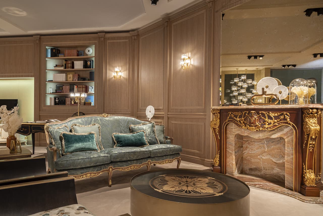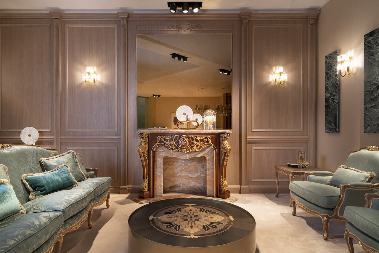 La nuova boiserie, espressione della capacità del brand di realizzare prodotti su misura e progetti contract, presenta una decorazione imponente caratterizzata dalla presenza del camino. L’incontro tra marmo, legno e oro definisce un ambiente living dallo charme classico e raffinato. Di natura floreale è, invece, il nuovo intarsio che adorna il coffe table di forma circolare, esempio fulgido della sapienza e della maestria di Angelo Cappellini nella lavorazione del legno, dove il top, contenuto dal foglio metallico che parla un’essenzialità squisitamente contemporanea, offre lo spettacolo della celebre tecnica classica che si cimenta con un decoro inedito.