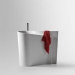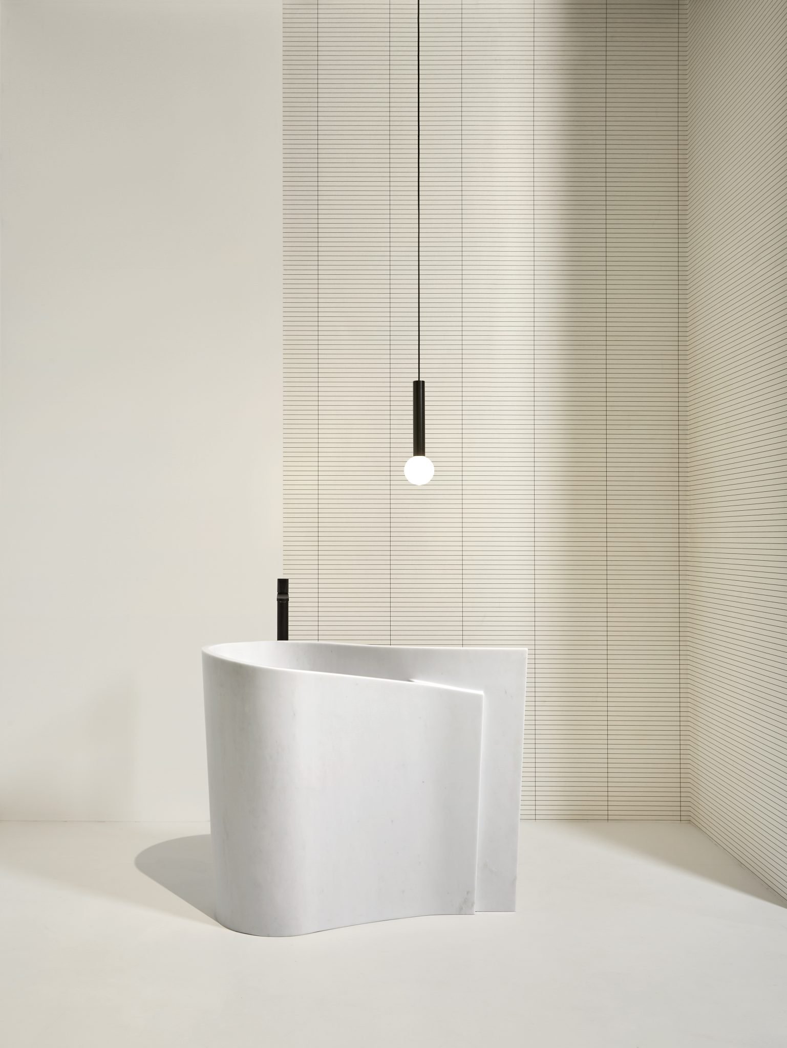 Un monolite di marmo, un oggetto scultoreo, elegante e sinuoso come un tessuto prezioso, capace di richiudersi esprimendo la propria energia come un’onda avvolgente che si infrange sugli scogli. Tutta la forza dell’acqua trova in questo lavabo un’espressione evidente, una naturalità accentuata dai due lembi che, non sovrapponendosi perfettamente, generano un pratico sistema d’appoggio per salviette e asciugamani.