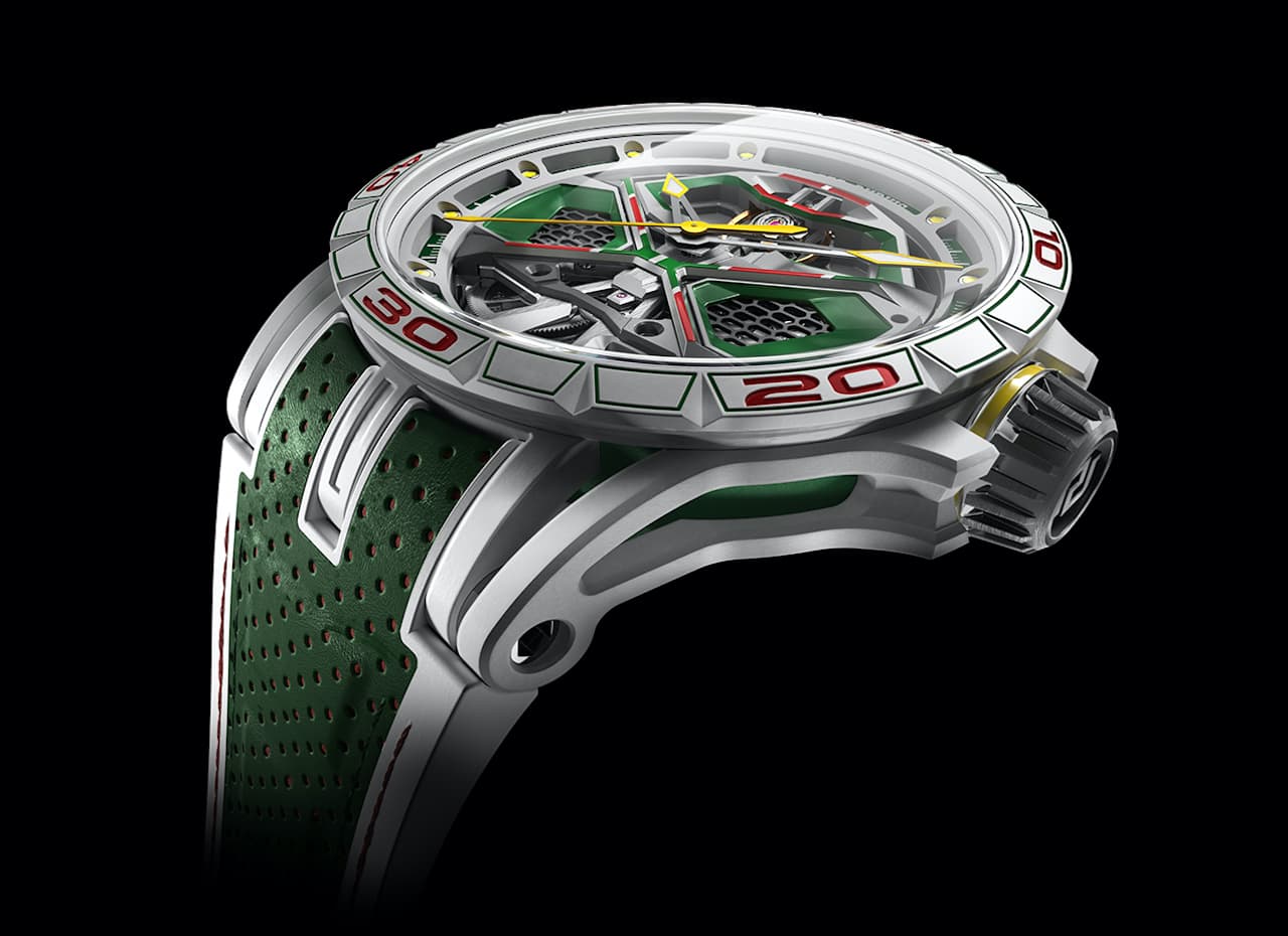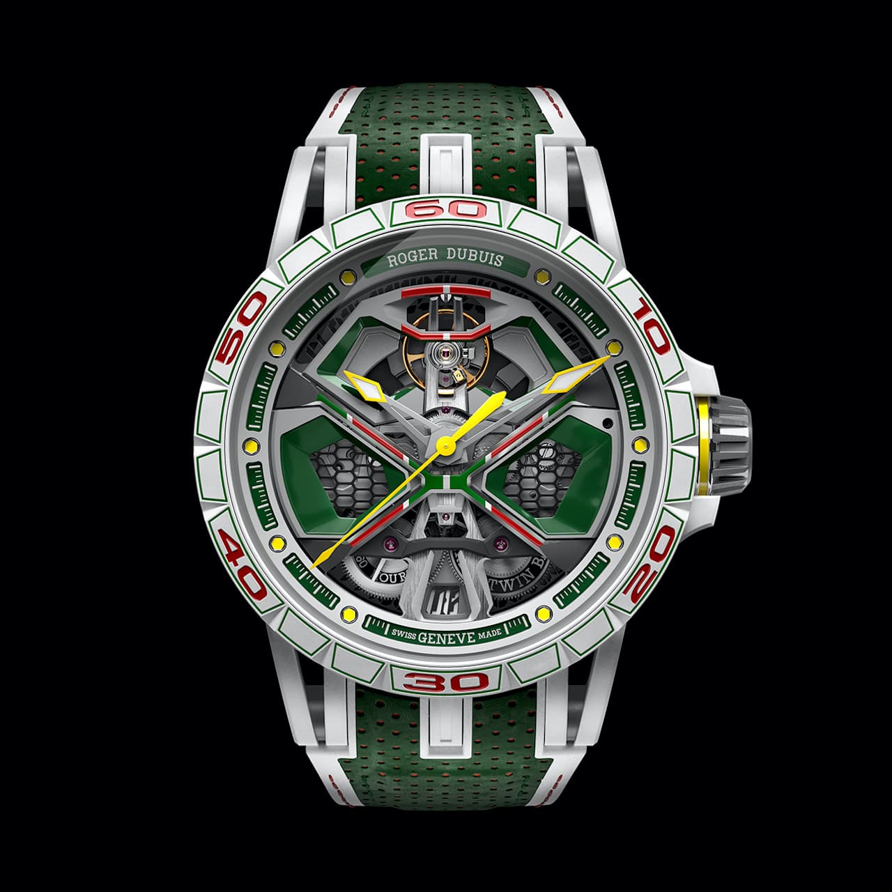 Roger Dubuis ha realizzato la cassa, la lunetta e la corona del nuovo Excalibur Spider Huracán MB in MCF – Mineral Composite Fibre. Sviluppato in esclusiva all’interno della Manifattura, questo materiale iper-tecnologico illustra la padronanza tecnica della Maison. La Manifattura integrata al 100% ha scoperto che la lavorazione del silicio con il processo di Sheet Molding Compound (SMC) portava alla realizzazione di un materiale del 13% più leggero del carbonio SMC. La leggerezza, non solo lo rende più comodo da indossare al polso, ma permette anche la creazione di design complessi grazie a una struttura resistente. Sempre con l’obiettivo di cercare l’estetica più espressiva, l’MCF di un bianco immacolato è ulteriormente esaltato da elementi decorativi nei colori verde, rosso e giallo vivaci per rendere omaggio al design della Huracán GT3 EVO. Le stesse tonalità sono riprese dal cinturino in caucciù bianco, che presenta elementi in pelle di vitello verde traforata da cui si intravede il rosso al di sotto. All’audace estetica si aggiungono anche le cuciture rosse, mentre la versatilità del cinturino è garantita dal sistema di sgancio rapido. Esclusivo come il Driver’s Club del Festival of Speed, l’Excalibur Spider Huracán MB è riservato a una tribù selezionata ed è pertanto prodotto in soli 88 esemplari.