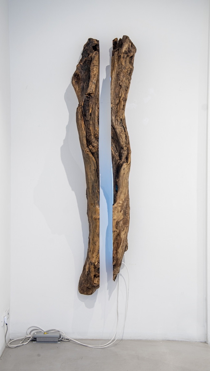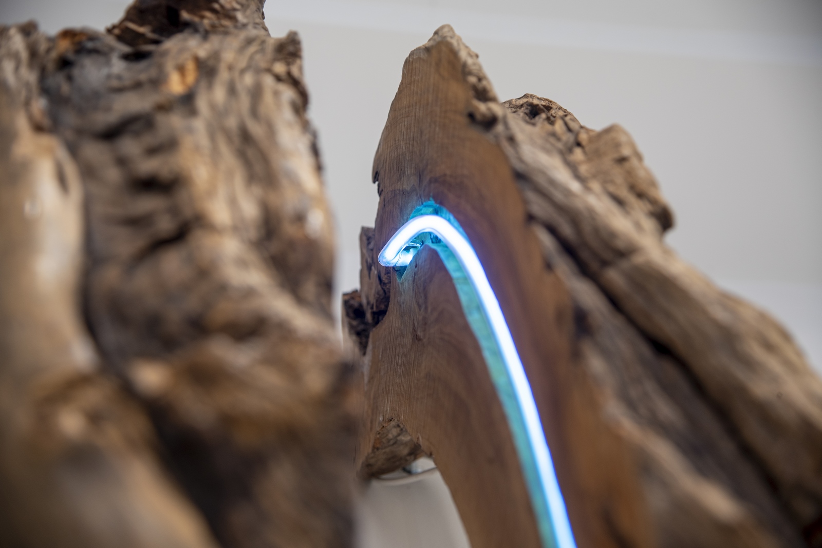 È infine esposta “Anima mundi”, una scultura/installazione composta da un grande tronco d’ulivo, sezionato e trafitto nell’anima da una fulgente lama di luce di neon blu. «Mater natura anima mundi: a chi o cosa risponde la vita, a quale legge? A quale mistero l’uomo deve credere per poter vivere? La natura – conclude il curatore – è l’anima del mondo e quindi dell’umanità. Il cuore dell’uomo è nella terra e la terra è il cuore della vita umana, senza questo accordo armonico il nostro petto smetterebbe di pulsare».