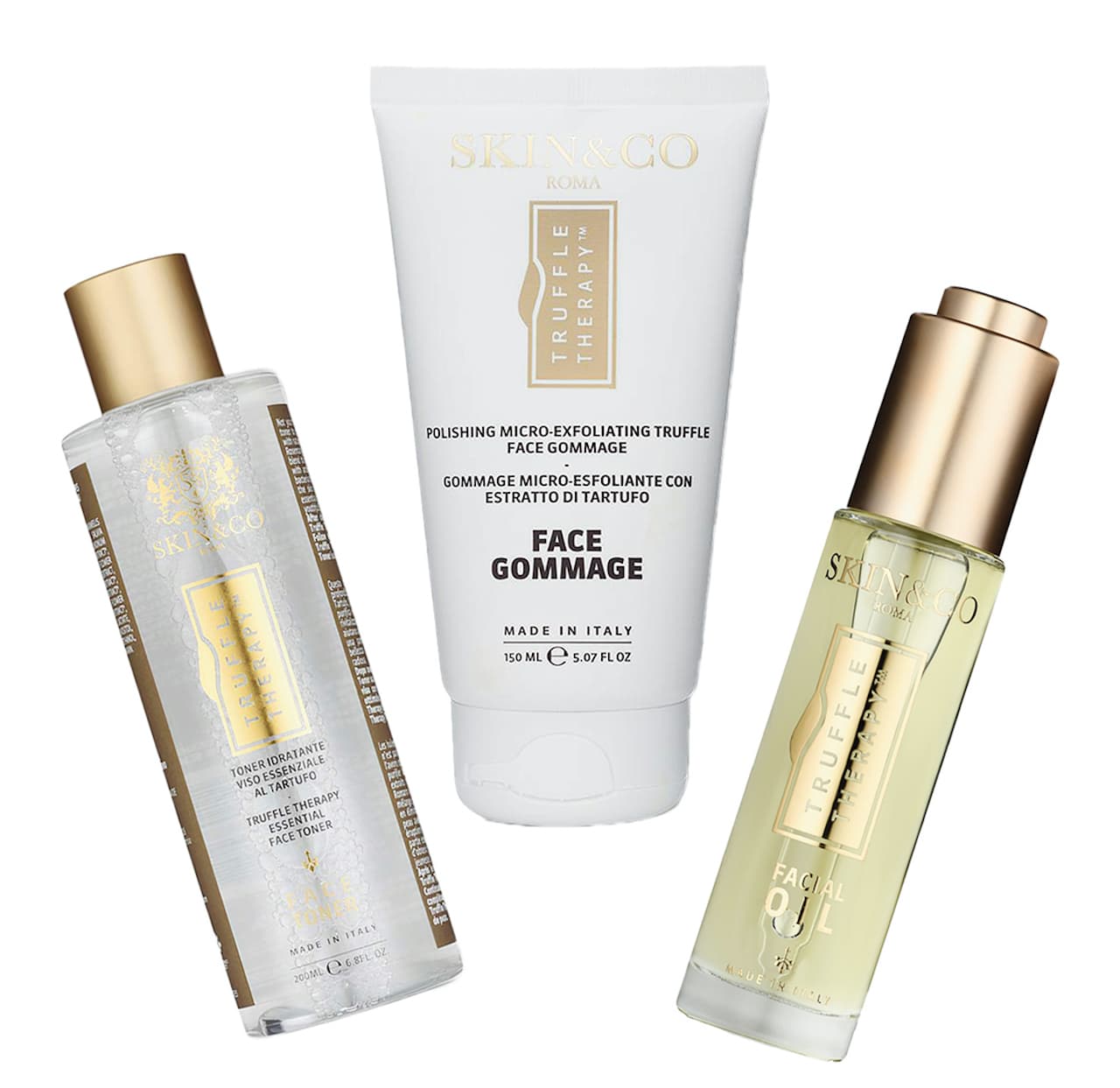 Ogni referenza, dalle creme idratanti al contorno occhi, dal siero viso al detergente viso, fino al bagno doccia esfoliante, firmate Skin & CO, si trova la presenza di un’eccellenza italiana: il tartufo nero. I prodotti sono realizzati al 99% con ingredienti di origine naturale, sostenibili e certificati biologici, per creare formule botaniche efficaci, vegane, clinicamente testate ed eco-friendly. Ne sono esempio alcuni prodotti:
